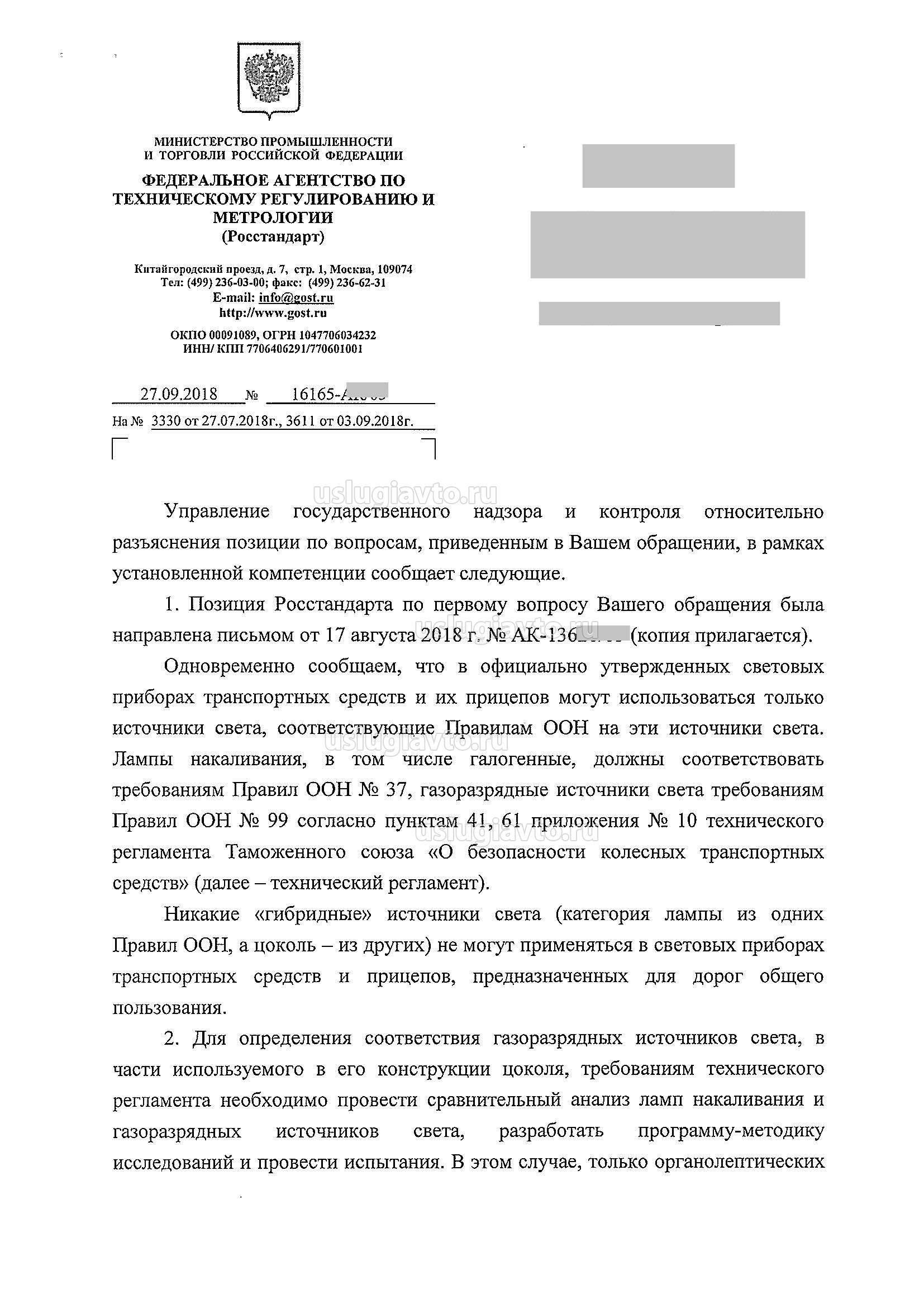 1. Позиция Госстандарта по первому вопросу Вашего обращения была направлена письмом от 17 августа 2018 г. № АК-136 (копия прилагается). Одновременно сообщаем, что в официально утвержденных световых приборах транспортных средств и их прицепов могут использоваться только источники света, соответствующие Правилам ООН на эти источники света. Лампы накаливания, в том числе галогенные, должны соответствовать требованиям Правил ООН № 37, газоразрядные источники света требованиям Правил ООН № 99 согласно пунктам 41, 61 приложения № 10 технического регламента Таможенного союза «О безопасности колесных транспортных средств» (далее - технический регламент). Никакие «гибридные» источники света (категория лампы из одних Правил ООН, а цоколь - из других) не могут применяться в световых приборах транспортных средств и прицепов, предназначенных для дорог общего пользования.