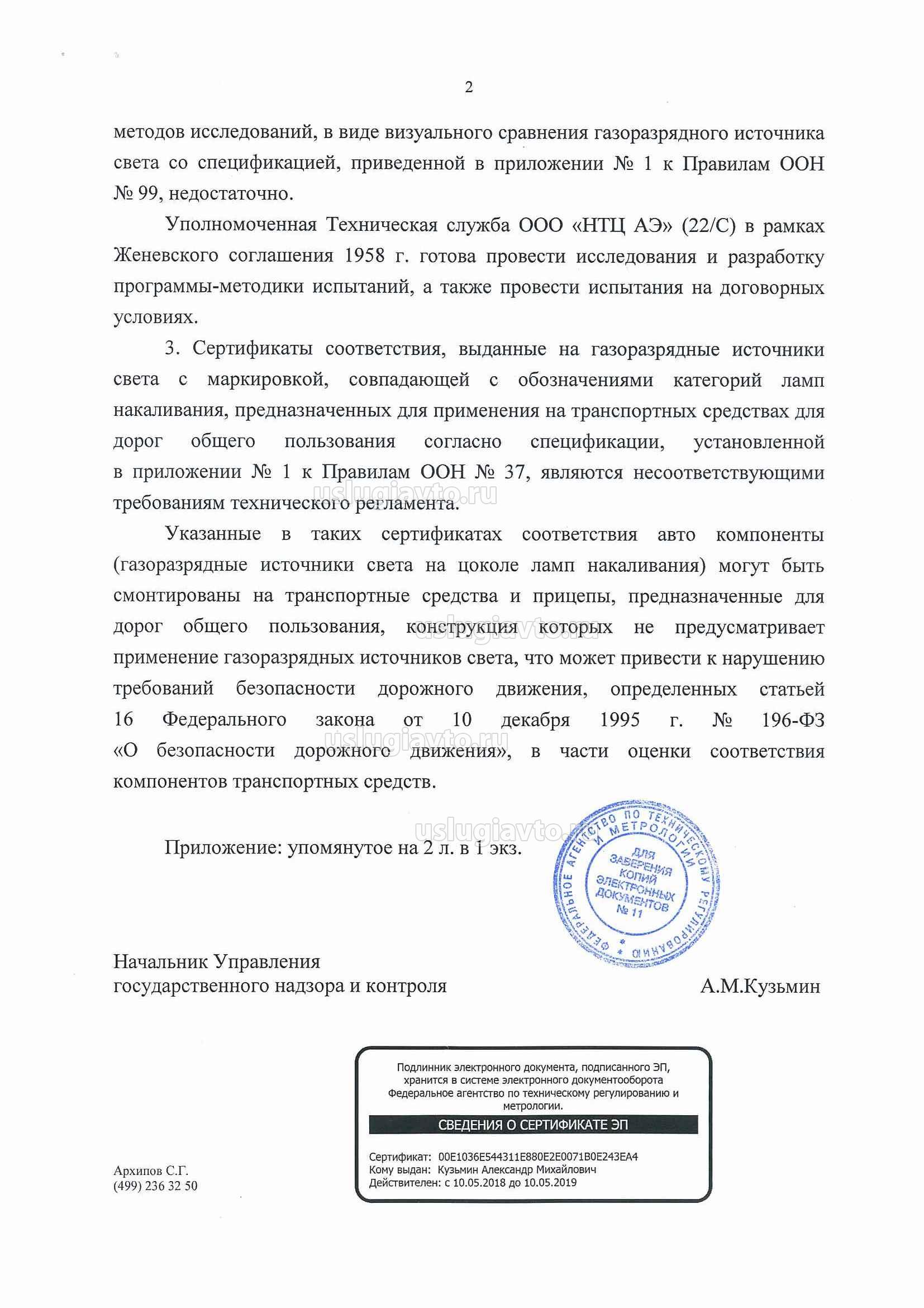 3. Сертификаты соответствия, выданные на газоразрядные источники света с маркировкой, совпадающей с обозначениями категорий ламп накаливания, предназначенных для применения на транспортных средствах для дорог общего пользования согласно спецификации, установленной в приложении № 1 к Правилам ООН № 37, являются несоответствующими требованиям технического регламента. Указанные в таких сертификатах соответствия авто компоненты (газоразрядные источники света на цоколе ламп накаливания) могут быть смонтированы на транспортные средства и прицепы, предназначенные для дорог общего пользования, конструкция которых не предусматривает применение газоразрядных источников света, что может привести к нарушению требований безопасности дорожного движения, определенных статьей 16 Федерального закона от 10 декабря 1995 г. №196-ФЗ «О безопасности дорожного движения», в части оценки соответствия компонентов транспортных средств. Приложение: упомянутое на 2 л. в 1 экз.