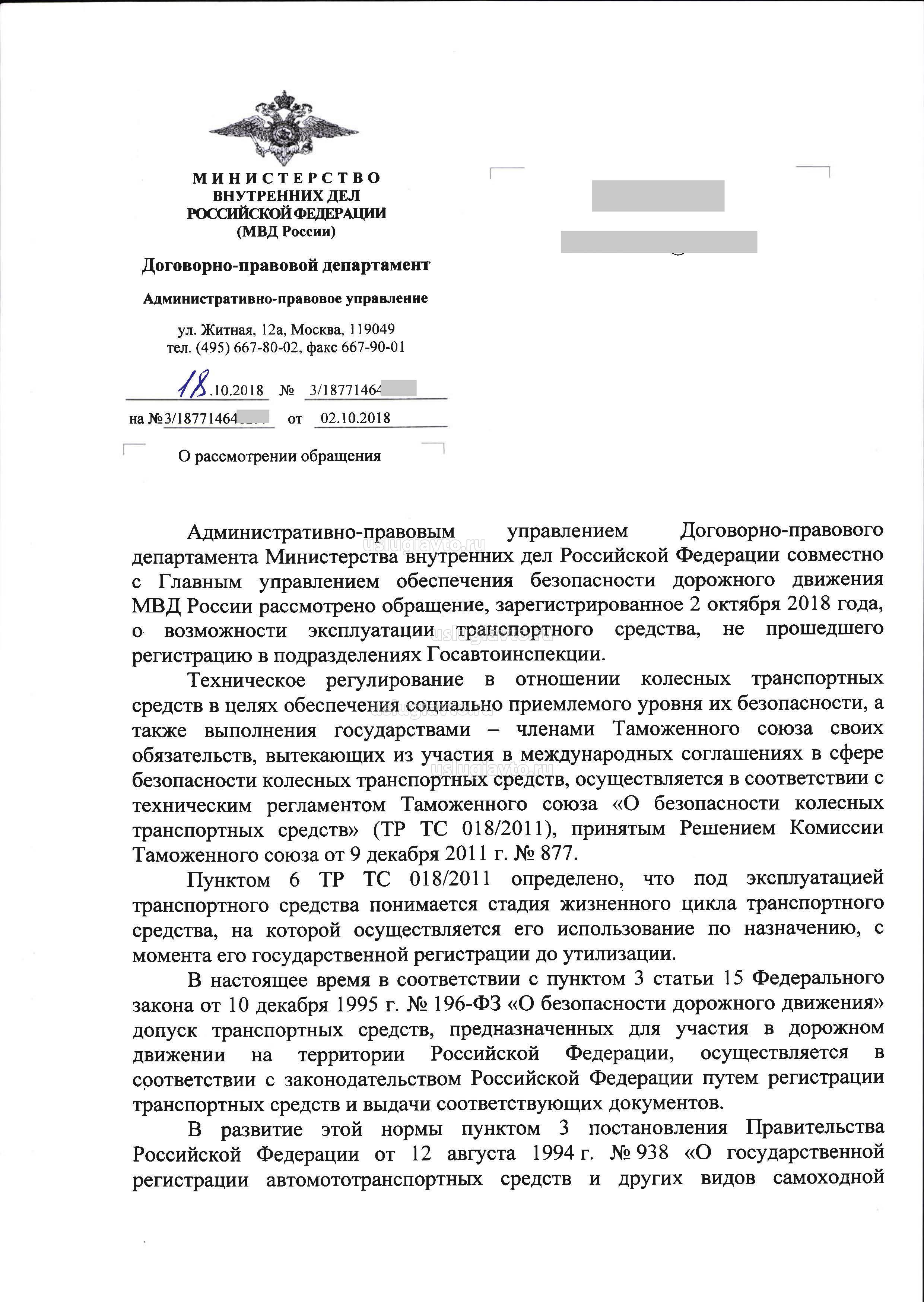 Административно-правовым управлением Договорно-правового департамента Министерства внутренних дел Российской Федерации совместно с Главным управлением обеспечения безопасности дорожного движения МВД России рассмотрено обращение, зарегистрированное 2 октября 2018 года, о возможности эксплуатации транспортного средства, не прошедшего регистрацию в подразделениях Госавтоинспекции. Техническое регулирование в отношении колесных транспортных средств в целях обеспечения социально приемлемого уровня их безопасности, а также выполнения государствами - членами Таможенного союза своих обязательств, вытекающих из участия в международных соглашениях в сфере безопасности колесных транспортных средств, осуществляется в соответствии с техническим регламентом Таможенного союза «О безопасности колесных транспортных средств» (ТР ТС 018/2011), принятым Решением Комиссии Таможенного союза от 9 декабря 2011 г. № 877. Пунктом 6 ТР ТС 018/2011 определено, что под эксплуатацией транспортного средства понимается стадия жизненного цикла транспортного средства, на которой осуществляется его использование по назначению, с момента его государственной регистрации до утилизации. В настоящее время в соответствии с пунктом 3 статьи 15 Федерального закона от 10 декабря 1995 г. № 196-ФЗ «О безопасности дорожного движения» допуск транспортных средств, предназначенных для участия в дорожном движении на территории Российской Федерации, осуществляется в соответствии с законодательством Российской Федерации путем регистрации транспортных средств и выдачи соответствующих документов. В развитие этой нормы пунктом 3 постановления Правительства Российской Федерации от 12 августа 1994 г. №938 «О государственной регистрации автомототранспортных средств и других видов самоходной техники на территории Российской Федерации» и пунктом 1 Основных положений по допуску транспортных средств к эксплуатации и обязанностям должностных лиц по обеспечению безопасности дорожного движения, утвержденных постановлением Совета Министров - Правительством Российской Федерации от 23 октября 1993 г. № 1090 «О правилах дорожного движения», закреплено, что механические транспортные средства (кроме мопедов) и прицепы должны быть зарегистрированы в Государственной инспекции безопасности дорожного движения Министерства внутренних дел Российской Федерации или иных органах, определяемых Правительством Российской Федерации, в течение срока действия регистрационного знака «Транзит» или 10 суток после их приобретения или таможенного оформления. При этом регистрация, в том числе временная, и изменение регистрационных данных транспортных средств не осуществляются без представления их собственниками или иными владельцами страхового полиса обязательного страхования гражданской ответственности владельца транспортного средства в случаях, когда обязанность по страхованию своей гражданской ответственности установлена законодательством Российской Федерации (абзац третий пункта 4 постановления Правительства Российской Федерации от 12 августа 1994 г. № 938). В соответствии с пунктом 2 статьи 4 Федерального закона от 25 апреля 2002 г. № 40-ФЗ «Об обязательном страховании гражданской ответственности владельцев транспортных средств» при возникновении права владения транспортным средство