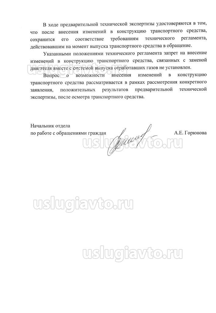 Сообщаем, что Ваше обращение от 02.10.2018, поступившее по информационным системам общего пользования, рассмотрено в Главном управлении по обеспечению безопасности дорожного движения Министерства внутренних дел Российской Федерации. Требования к двигателю и его системам, находящихся в эксплуатации транспортных средств, установлены разделом 9 приложения №8 к техническому регламенту Таможенного союза «О безопасности колесных транспортных средств», утвержденному решением Комиссии Таможенного союза от 09.12.2011 № 877. В соответствии с пунктом 9.10 данного приложения, не допускается внесение изменений в конструкцию системы выпуска отработавших газов. Порядок проверки выполнения требований к транспортным средствам, находящимся в эксплуатации, в случае внесения изменений в их конструкцию определен статьей 4 раздела V технического регламента. В соответствии с пунктом 75 технического регламента, проверка выполнения требований к транспортным средствам, находящимся в эксплуатации, в случае внесения изменений в их конструкцию осуществляется в форме предварительной технической экспертизы конструкции на предмет возможности внесения изменений и последующей проверки безопасности конструкции и технического осмотра транспортного средства с внесенными в конструкцию изменениями. В ходе предварительной технической экспертизы удостоверяются в том, что после внесения изменений в конструкцию транспортного средства, сохранится его соответствие требованиям технического регламента, действовавшим на момент выпуска транспортного средства в обращение. Указанными положениями технического регламента запрет на внесение изменений в конструкцию транспортного средства, связанных с заменой двигателя вместе с системой выпуска отработавших газов не установлен. Вопрос о возможности внесения изменений в конструкцию транспортного средства рассматривается в рамках рассмотрения конкретного заявления, положительных результатов предварительной технической экспертизы, после осмотра транспортного средства.
