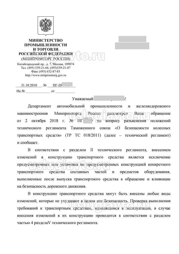 Департамент автомобильной промышленности и железнодорожного машиностроения Минпромторга России рассмотрел Ваше обращение от 2 октября 2018 г. № ПГ-9559 по вопросу разъяснения положений технического регламента Таможенного союза «О безопасности колесных транспортных средств» (ТР ТС 018/2011) (далее - технический регламент) и сообщает. В соответствии с разделом II технического регламента, внесением изменений в конструкцию транспортного средства является исключение предусмотренных или установка не предусмотренных конструкцией конкретного транспортного средства составных частей и предметов оборудования, выполненные после выпуска транспортного средства в обращение и влияющие на безопасность дорожного движения. В конструкцию транспортного средства могут быть внесены любые виды изменений, которые не ухудшают в целом его безопасность. Проверка выполнения требований к транспортным средствам, находящимся в эксплуатации, в случае внесения изменений в их конструкцию проводится в соответствии с разделом частью 4 раздела V технического регламента. При этом, в соответствии с пунктом 77 транспортные средства не подлежат вышеуказанной проверке в том числе в случае установки на транспортное средство компонентов предназначенных для этого транспортного средства и прошедших оценку соответствия в составе данного транспортного средства, что подтверждено документацией изготовителя компонентов, или компонентов, предусмотренных изготовителем транспортного средства в эксплуатационной документации. В свою очередь, в случае отсутствия документов, подтверждающих соответствие указанного в Вашем обращении транспортного средства с установленным на неё не заводским глушителем требованиям, действовавшим на момент выпуска в обращение данного транспортного средства, в целях подтверждения выполнения требований к транспортным средствам, находящимся в эксплуатации, предусмотренной разделом 4 технического регламента, в случае внесения изменений в их конструкцию, считаем целесообразным обратиться в аккредитованную испытательную лабораторию и подтвердить что после внесения изменений в конструкцию транспортного средства его безопасность соответствует требованиям технического регламента. Заключение лаборатории, полученное по результатам вышеуказанной проверки необходимо представить в орган ГИБДД с целью получения свидетельства о соответствии транспортного средства с внесенными в его конструкцию изменениями требованиям безопасности в соответствии с пунктом 79 технического регламента. Обращаем внимание, что пункт 12 технического регламента, упомянутый Вами в обращении не допускает наличие озоноразрушающих веществ и материалов, перечень которых утвержден Комиссией Таможенного союза, в составе кондиционеров, а также холодильного оборудования, применяемых на транспортных средствах.