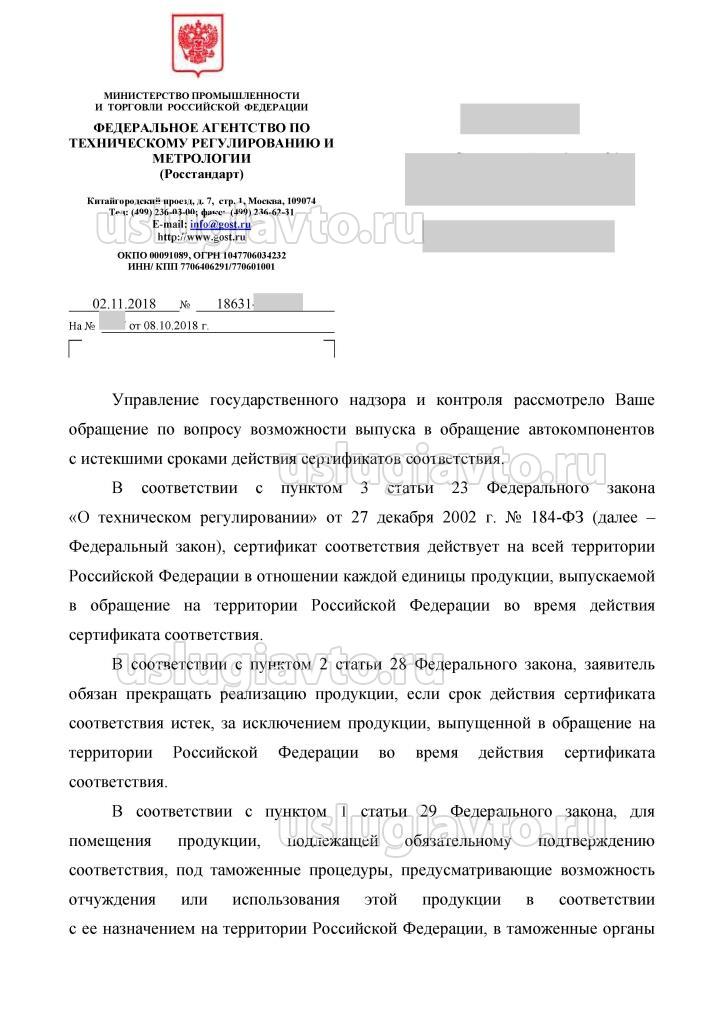Управление государственного надзора и контроля рассмотрело Ваше обращение по вопросу возможности выпуска в обращение автокомпонентов с истекшими сроками действия сертификатов соответствия.