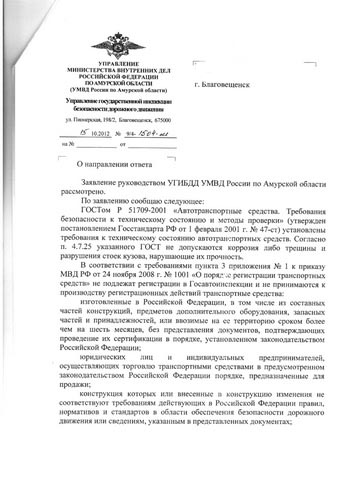 Здесь нет конкретики. Да и мне не понятно каким образом регламент в Вашем конкретном случае ссылается на ГОСТ Р 51709-2001. Отказ ГИБДД должен быть мотивирован, т.е. например отказано по причине несоответствия таким-то пунктам. В Вашем случае отсутствует логическая цепочка отказа, т.е. каждый случай регулируется конкретным разделом регламента и конкретными пунктами.Распоряжение Правительства Российской Федерации от 12 октября 2010 г. N 1750-р г. Москва , в распоряжении 139 документов , под номером 35 ГОСТ Р 51709-2001