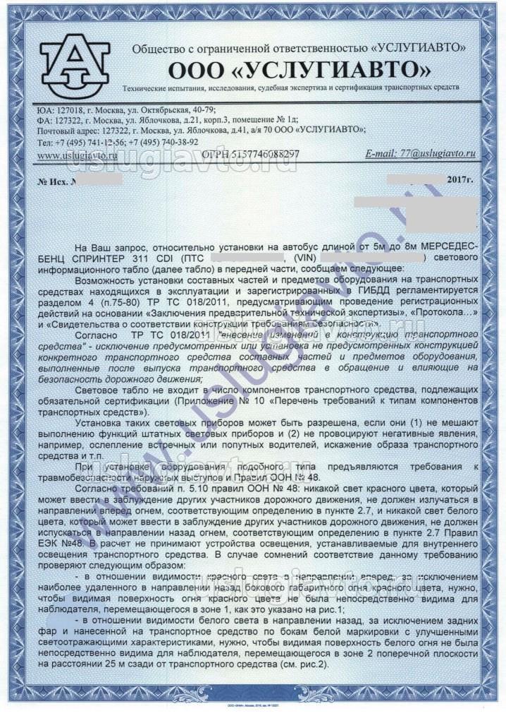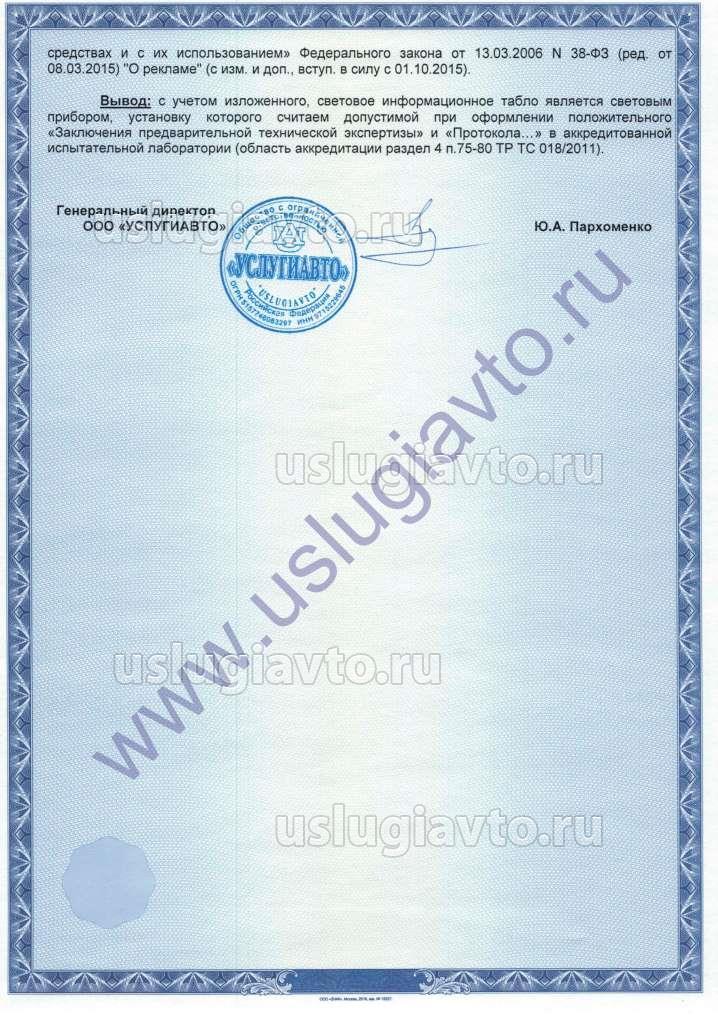 Вывод: с учетом изложенного, световое информационное табло является световым прибором, установку которого считаем допустимой при оформлении положительного «Заключения предварительной технической экспертизы» и «Протокола…» в аккредитованной испытательной лаборатории (область аккредитации раздел 4 п.75-80 ТР ТС 018/2011).