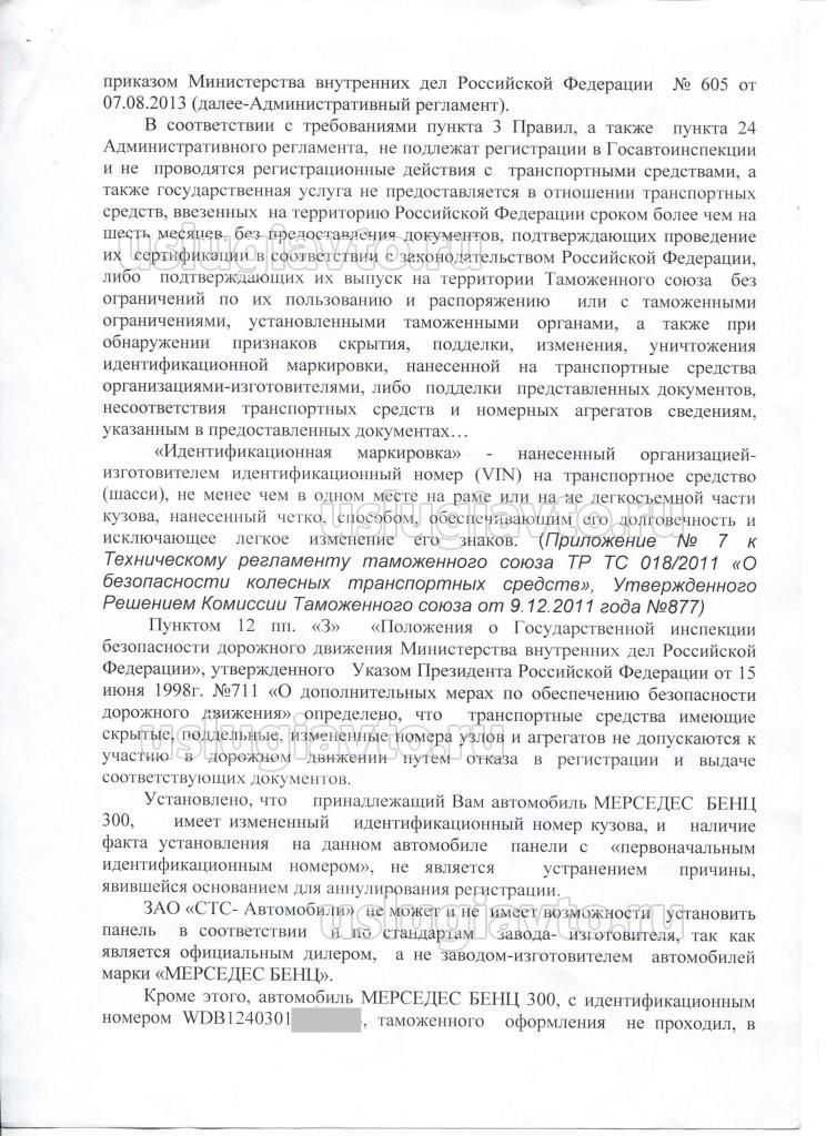 приказом Министерства внутренних дел Российской Федерации № 605 от 07.08.2013 (далее-Административный регламент). В соответствии с требованиями пункта 3 Правил, а также пункта 24 Административного регламента, не подлежат регистрации в Госавтоинспекции и не проводятся регистрационные действия с транспортными средствами, а также государственная услуга не предоставляется в отношении транспортных средств, ввезенных на территорию Российской Федерации сроком более чем на шесть месяцев, без предоставления документов, подтверждающих проведение их сертификации в соответствии с законодательством Российской Федерации, либо подтверждающих их выпуск на территории Таможенного союза без ограничений по их пользованию и распоряжению или с таможенными ограничениями, установленными таможенными органами, а также при обнаружении признаков скрытия, подделки, изменения, уничтожения идентификационной маркировки, нанесенной на транспортные средства организациями-изготовителями, либо подделки представленных документов, несоответствия транспортных средств и номерных агрегатов сведениям, указанным в предоставленных документах... «Идентификационная маркировка» - нанесенный организацией-изготовителем идентификационный номер (VIN) на транспортное средство (шасси), не менее чем в одном месте на раме или на не легкосъемной части кузова, нанесенный четко, способом, обеспечивающим его долговечность и исключающее легкое изменение его знаков. (Приложение № 7 к Техническому регламенту таможенного союза ТР ТС 018/2011 «О безопасности колесных транспортных средств», Утвержденного Решением Комиссии Таможенного союза от 9.12.2011 года №877) Пунктом 12 пп. «3» «Положения о Государственной инспекции безопасности дорожного движения Министерства внутренних дел Российской Федерации», утвержденного Указом Президента Российской Федерации от 15 июня 1998г. №711 «О дополнительных мерах по обеспечению безопасности дорожного движения» определено, что транспортные средства имеющие скрытые, поддельные, измененные номера узлов и агрегатов не допускаются к участию в дорожном движении путем отказа в регистрации и выдаче соответствующих документов. Установлено, что принадлежащий Вам автомобиль МЕРСЕДЕС БЕНЦ 300, имеет измененный идентификационный номер кузова, и наличие факта установления на данном автомобиле панели с «первоначальным идентификационным номером», не является устранением причины, явившейся основанием для аннулирования регистрации. ЗАО «СТС- Автомобили» не может и не имеет возможности установить панель в соответствии и по стандартам завода- изготовителя, так как является официальным дилером, а не заводом-изготовителем автомобилей марки «МЕРСЕДЕС БЕНЦ». Кроме этого, автомобиль МЕРСЕДЕС БЕНЦ 300, с идентификационным номером WDB1240301ХХХ, таможенного оформления не проходил, в органах ГИБДД не регистрировался, паспорт транспортного средства на него не выдавался. На основании изложенного, в предоставлении государственной услуги по восстановлению регистрации автомобиля МЕРСЕДЕС БЕНЦ 300, с идентификационным номером WDB1240301ХХХХ (WDB1240301ХХХХХ), Вам отказано, по причине изменения, уничтожения идентификационной маркировки, нанесенной организацией-изготовителем, а также в связи с тем, что автомобиль не проходил таможенное оформление. Данное решение Вы можете обжа