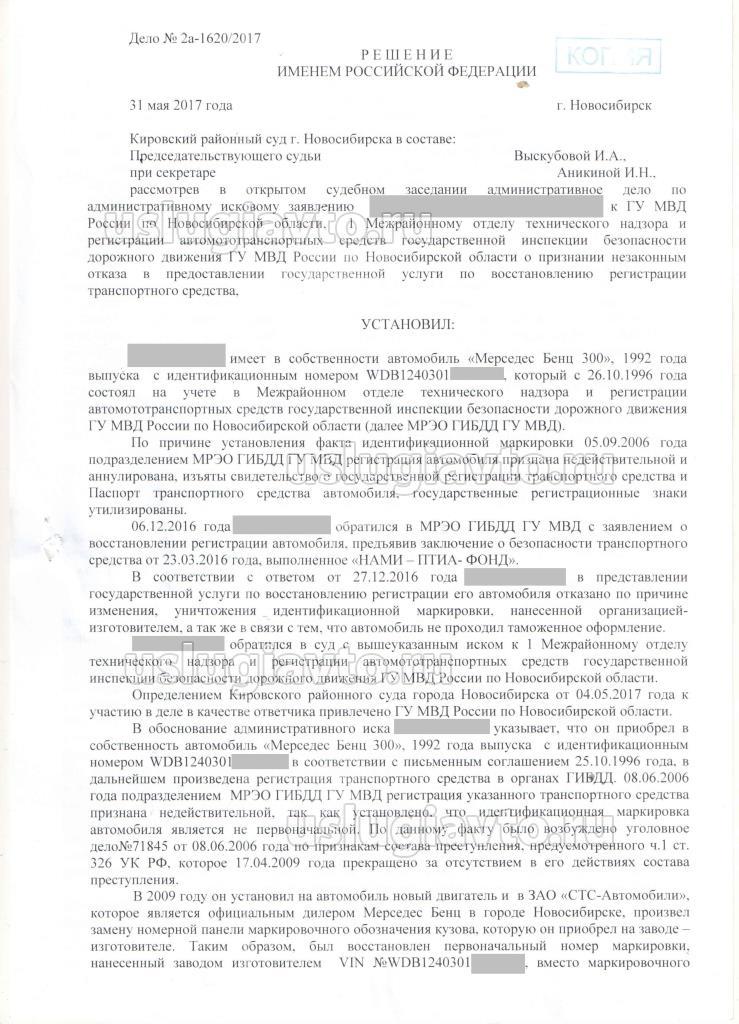 Ваше заявление, поступившее в Межрайонный отдел технического надзора и регистрации автомототранспортных средств Государственной инспекции безопасности дорожного движения №1 Главного Управления Министерства внутренних дел России по Новосибирской области, рассмотрено. Сообщаем Вам, что на аналогичное Ваше обращение в 2014 году по вопросу восстановления регистрации принадлежащего Вам автомобиля МЕРСЕДЕС БЕНЦ 300, 08.11.2014 за исх.№ ХХХ Вам уже было отказано в предоставлении государственной услуги. Повторно разъясняем Вам, что порядок регистрации транспортных средств определен правилами регистрации автомототранспортных средств и прицепов к ним в Государственной инспекции безопасности дорожного движения Министерства внутренних дел Российской Федерации, утвержденными приказом Министерства внутренних дел Российской Федерации от 24.11.2008 № 1001 (далее Правил), а последовательность административных процедур (действий) должностных лиц по предоставлению государственной услуги по регистрации автотранспортных средств и прицепов к ним, определяет Административный регламент Министерства внутренних дел Российской Федерации, утвержденный