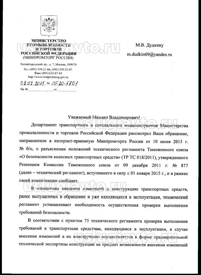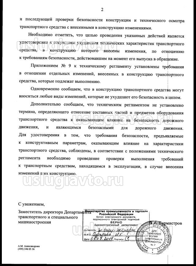 Дополнительно сообщаем, что техническим регламентом не установлено термина, определяющего отнесение составных частей и предметов оборудования транспортного средства к оказывающим влияние на безопасность дорожного движения, и являющимся безопасными для дорожного движения. Для удостоверения в том, что требования безопасности, предъявляемые к конструктивным параметрам, оказывающим влияние на характеристики транспортного средства, соблюдены, в соответствии с положениями технического регламента необходимо проведение проверки выполнения требований к транспортным средствам, находящимся в эксплуатации, в случае внесения изменений в их конструкцию. (Разъяснение Минпромторга России от 2 июня 2015 г. № ПГ-20-5801 Лист 1 Лист 2)