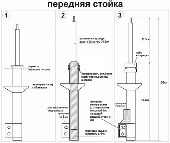 1. переделанные(неразборные в разборные), удлиннёные и усиленные б/у-шные стойки амортизаторов с установленными в них заменяемыми амортизаторами(картриджами) + усиленные пружины - это даст лифт в районе 5-7см.