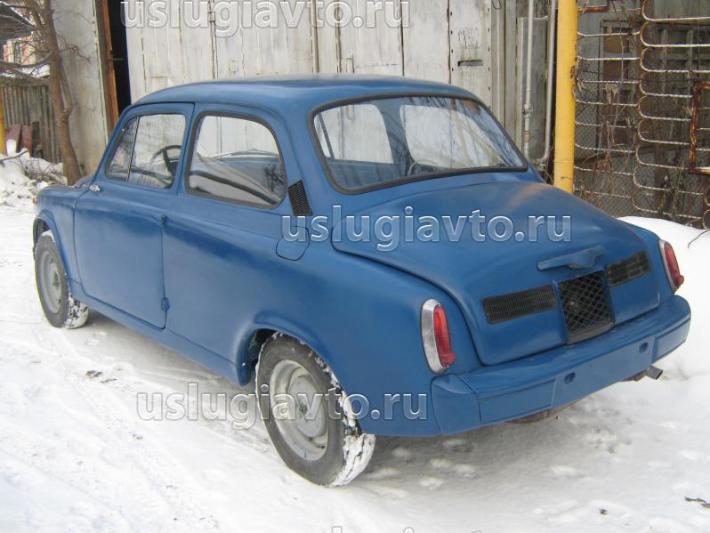 Кузов для удобства увеличен в размерах. База: 2400мм, передняя колея: 1300мм, задняя:1250мм. Днище и все перегородки из стеклопластика (2 слоя, между ними пенопласт) с каркасом из труб. Со стороны моторного отсека - лист алюминия. Лобовое стекло ЗАЗ-968. Замки дверей М-412. Наружные панели и крылья - съемные - переделанные. Задние крылья - стеклопластик.