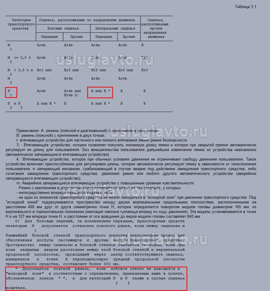 Допускается установка поясных ремней на ТС категории N1 (см. примечанме к Таблице 3.1)