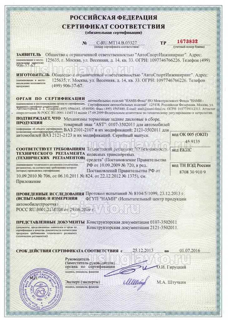 Вот, нашел сертификат на задние дисковые тормозные механизмы для ВАЗ-2101...2107.