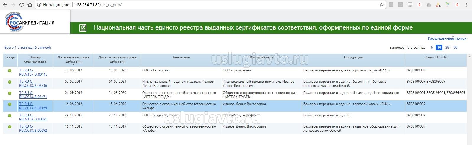 Пробил сертификаты на бамперы "РИФ" на сайте Росаккредитации.