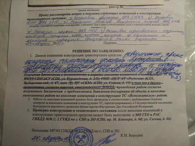 Здравствуйте. С "Заявлением на внесение изменений в конструкцию ТС" у меня возникли определённые трудности. Обратившись в МРЭО-17 С-Пб по месту регистрации ТС, я подал начальнику Бородину К.Н. заявление, в котором указал: