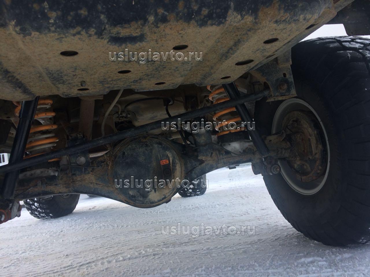 установлен мост УАЗ, рессоры УАЗ, рулевые тяги УАЗ, тяга панара УАЗ, амморты TLC80, дисковые тормоза.