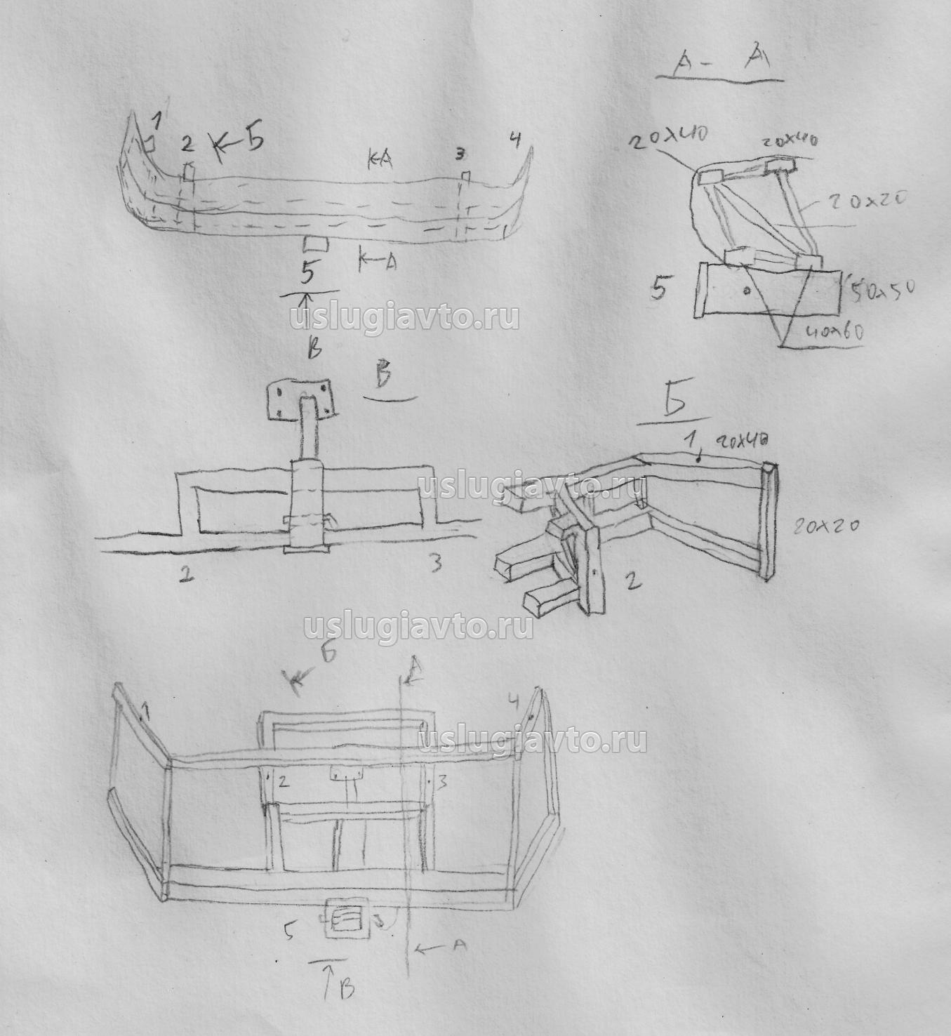 Штатно бампера крепятся П-образными кронштейнами. Мы планируем закрепить бампер на каркасе из профильной трубы и уже каркас к кузову. Прилагаю эскиз заднего усилителя:
