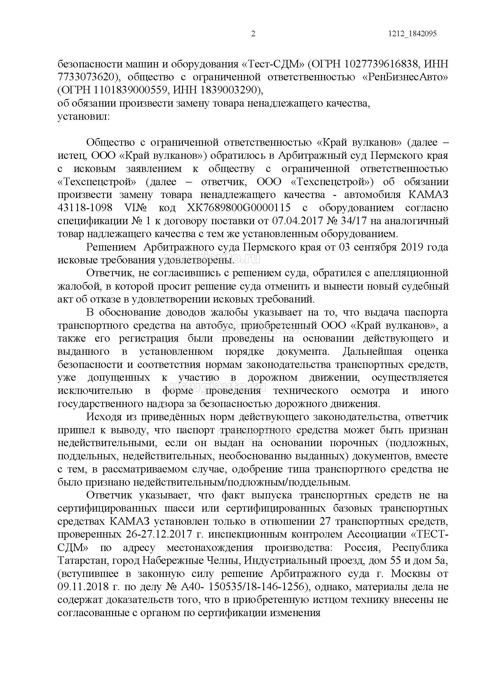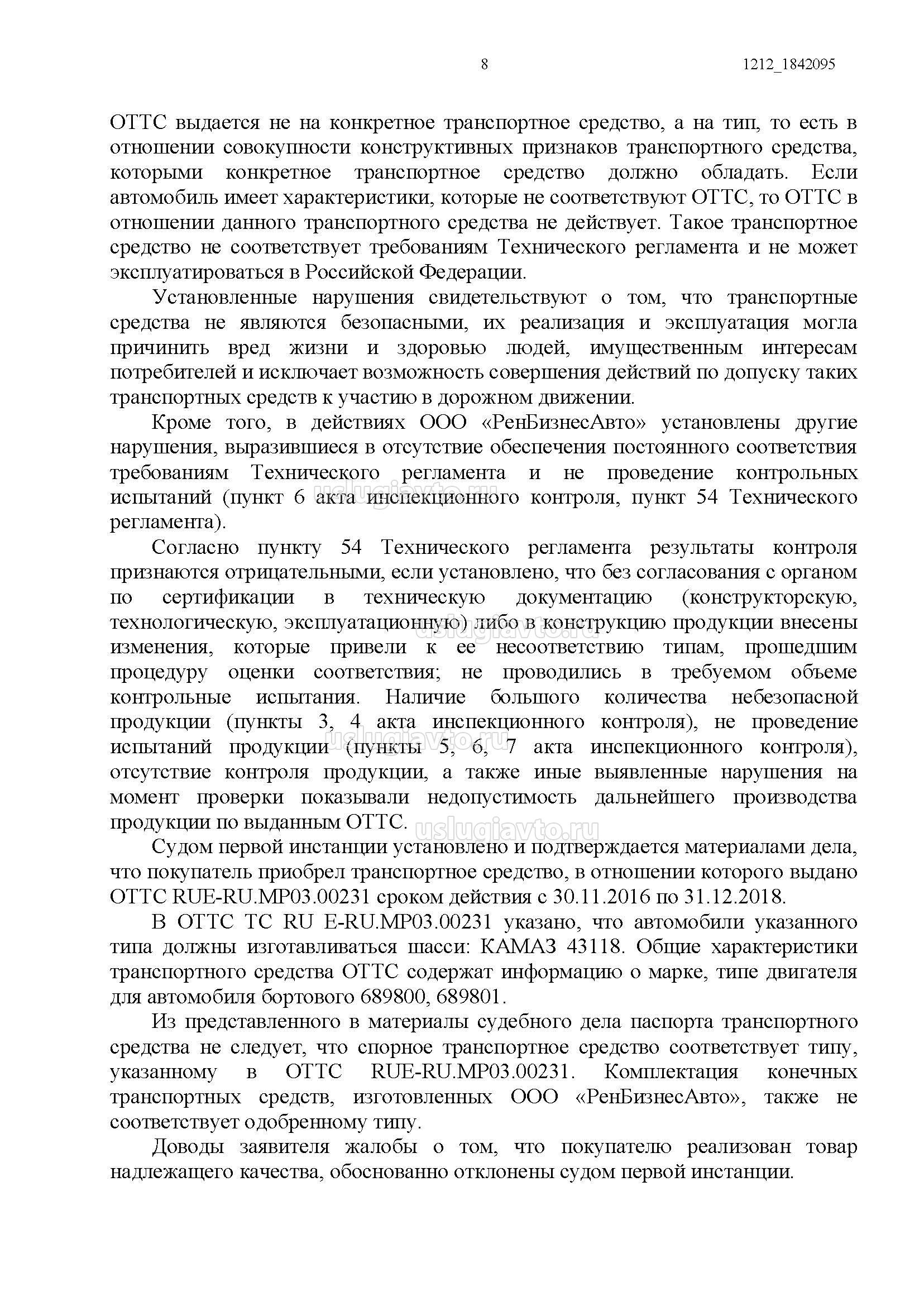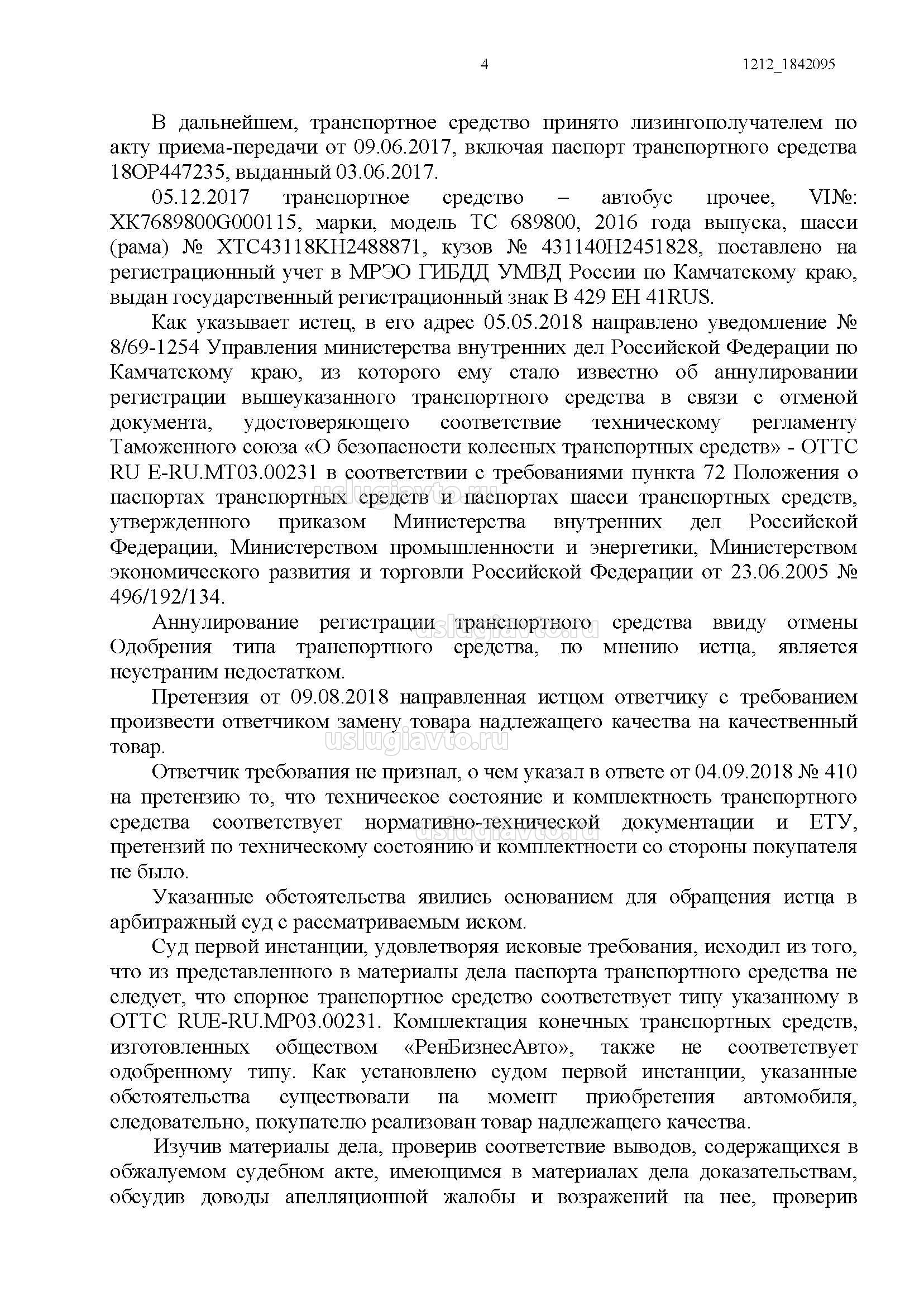 Из представленного в материалы судебного дела паспорта транспортного средства не следует, что спорное транспортное средство соответствует типу, указанному в ОТТС RUE-RU.MP03.00231. Комплектация конечных транспортных средств, изготовленных ООО «РенБизнесАвто», также не соответствует одобренному типу.Доводы заявителя жалобы о том, что покупателю реализован товар надлежащего качества, обоснованно отклонены судом первой инстанции.Судом установлено, что несоответствие переданного товара существовало на момент приобретения автомобиля. Более того, суд апелляционной инстанции отмечает, что переоборудование ООО «РенБизнесАвто» поставляемого автомобиля осуществлено в 2017 году, в рамках судебного дела № А40-150535/2018 установлено, что во все проверенные транспортные средства были внесены не согласованные с органом по сертификации изменения.