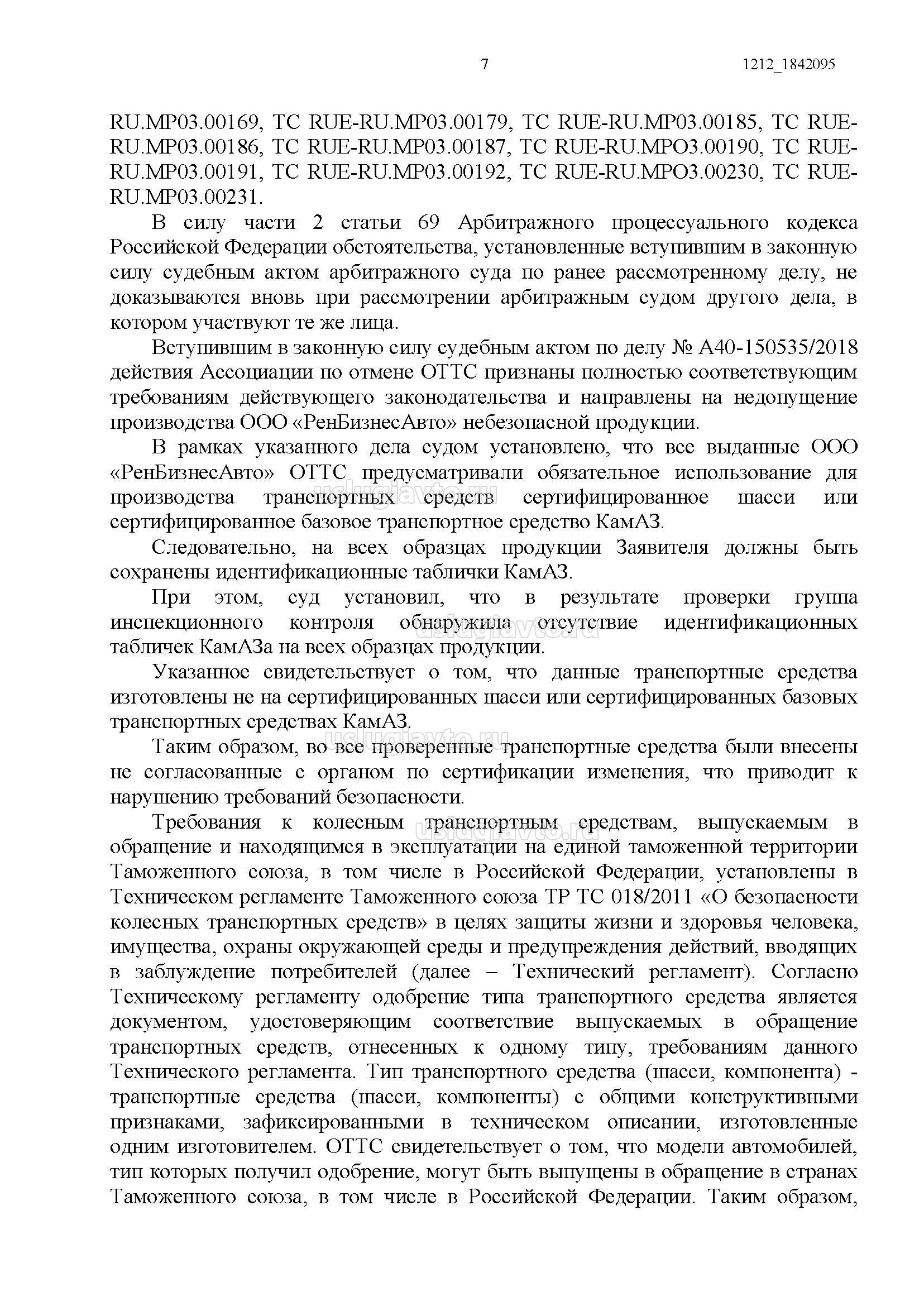 В рамках указанного дела судом установлено, что все выданные ООО «РенБизнесАвто» ОТТС предусматривали обязательное использование для производства транспортных средств сертифицированное шасси или сертифицированное базовое транспортное средство КамАЗ. Следовательно, на всех образцах продукции Заявителя должны быть сохранены идентификационные таблички КамАЗ.
