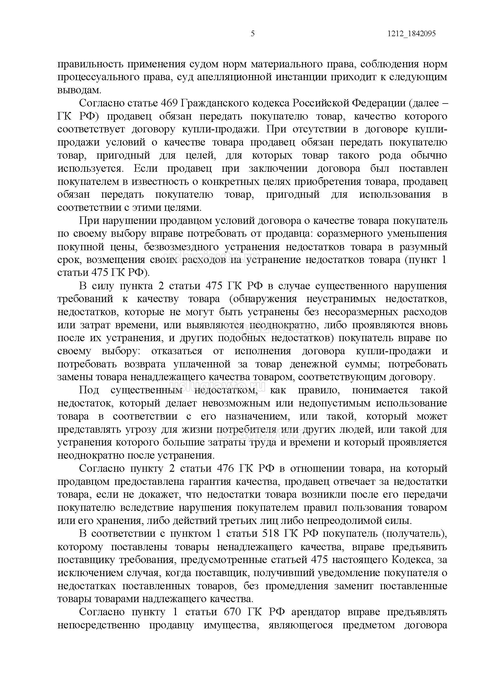 Согласно статье 469 Гражданского кодекса Российской Федерации (далее –ГК РФ) продавец обязан передать покупателю товар, качество которого соответствует договору купли-продажи. При отсутствии в договоре купли- продажи условий о качестве товара продавец обязан передать покупателю товар, пригодный для целей, для которых товар такого рода обычно используется. Если продавец при заключении договора был поставлен покупателем в известность о конкретных целях приобретения товара, продавец обязан передать покупателю товар, пригодный для использования в соответствии с этими целями. При нарушении продавцом условий договора о качестве товара покупатель по своему выбору вправе потребовать oт продавца: соразмерного уменьшения покупной цены, безвозмездного устранения недостатков товара в разумный срок, возмещения своих расходов на устранение недостатков товара (пункт 1 статьи 475 ГК РФ).