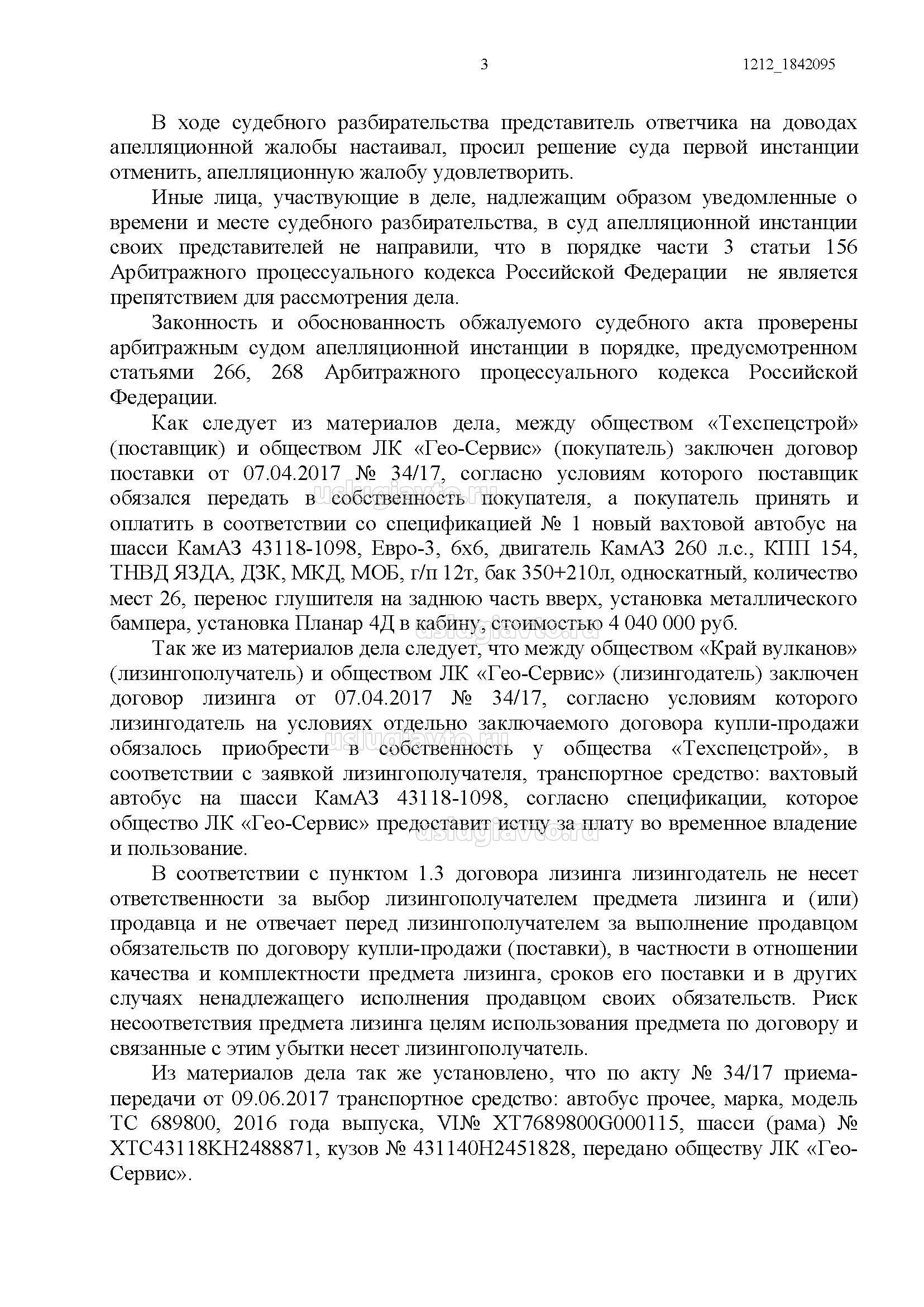 Так же из материалов дела следует, что между обществом «Край вулканов» (лизингополучатель) и обществом ЛК «Гео-Сервис» (лизингодатель) заключен договор лизинга от 07.04.2017 № 34/17, согласно условиям которого лизингодатель на условиях отдельно заключаемого договора купли-продажи обязалось приобрести в собственность у общества «Техспецстрой», в соответствии с заявкой лизингополучателя, транспортное средство: вахтовый автобус на шасси КамАЗ 43118-1098, согласно спецификации, которое общество ЛК «Гео-Сервис» предоставит истцу за плату во временное владение и пользование.