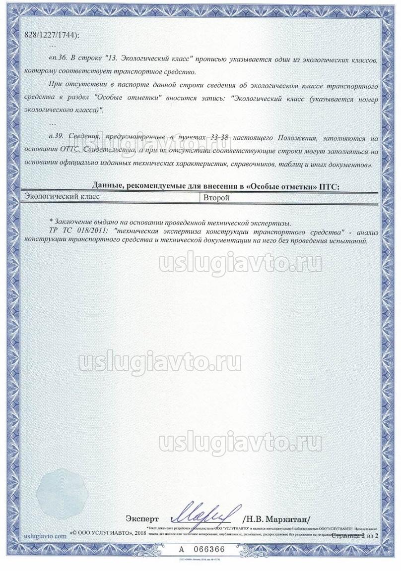 Пример Заключения экспертизы экологического класса автомобиля для внесения сведений в систему регистрационного учета транспортных средств.