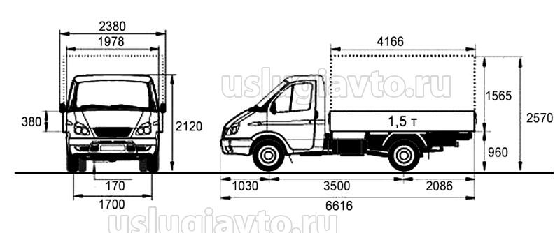 В качестве базовой, выбрана рама серийно выпускаемого сертифицированного автомобиля ГАЗ-330202, имеющего максимальную колесную базу 3500 мм, полную массу 3500 кг (1290 кг на переднюю ось, 2210 кг на заднюю ось). Габаритные размеры автомобиля приведены на