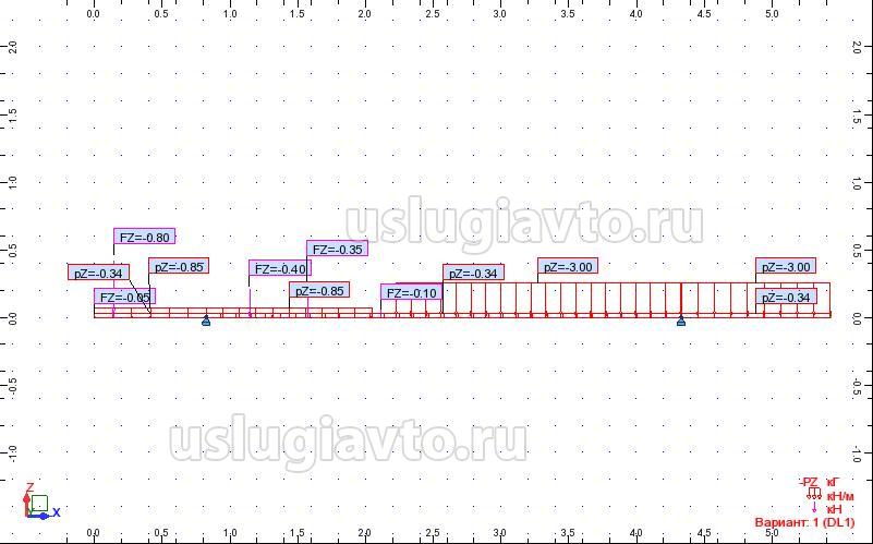 Балка нагружается сосредоточенными и распределенными по длине силами, соответствующими подрессоренным массам установленных на раме агрегатов, кабины, платформы, экипажа и груза до значения нагрузок на оси от полной массы за вычетом неподрессоренных масс. Опоры балки соответствуют центрам колес автомобиля. Расчетная схема показана на