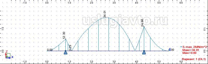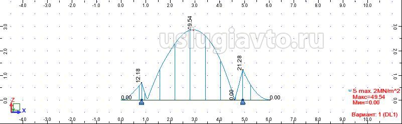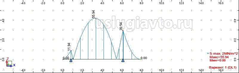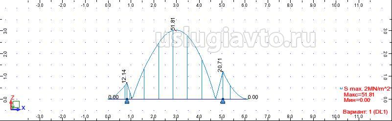 Расчет рам с удлиненной базой колес производился без удлинения заднего свеса автомобиля ГАЗ-320202. С точки зрения сопротивления материалов задний свес лонжерона рамы является консольной балкой с равнораспределенной по длине нагрузкой. Удлинение заднего свеса приводит к перераспределению реакций опор (нагрузок на оси), как указывалось выше, следовательно, к переопределению напряжений по длине рамы. Но, при этом, коэффициент запаса прочности не ухудшается. Для подтверждения этого вывода на Рис.8 показана эпюра напряжений лонжерона рамы с колесной базой 5250 мм и задним свесом, удлиненным на 700 мм.