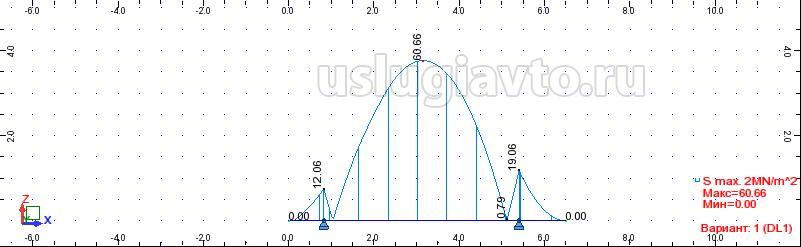 Эпюра напряжений лонжерона рамы автомобиля с колесной базой 4570 мм показана на Рис.6. Максимальные напряжения – 60 Мпа, коэффициент запаса прочности – 4.2.