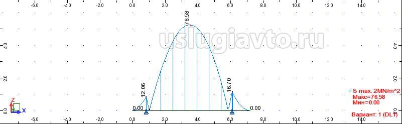 Эпюра напряжений лонжерона рамы автомобиля с колесной базой 5250 мм показана на Рис.7. Максимальные напряжения – 76,5 Мпа, коэффициент запаса прочности – 3.3.