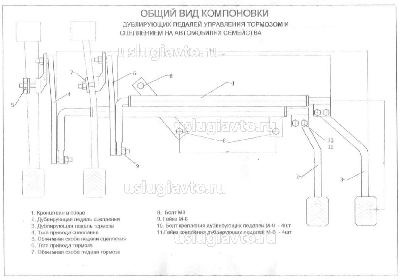 Описание производимых работ: Рядом с местом водителя-ученика оборудуется рабочее место инструктора с дублирующими педалями управления тормозной системой и сцеплением (МКПП). Дублирующие педали управления выполняются в соответствии с требованиями Правил ЕЭК ООН № 35. При переоборудовании должны быть использованы механические приводы стандартной конструкции гарантированной прочности. Конструкция дополнительного привода и расположение дублирующих педалей не должны препятствовать функционированию рабочей тормозной системы автомобиля и приводу сцепления.