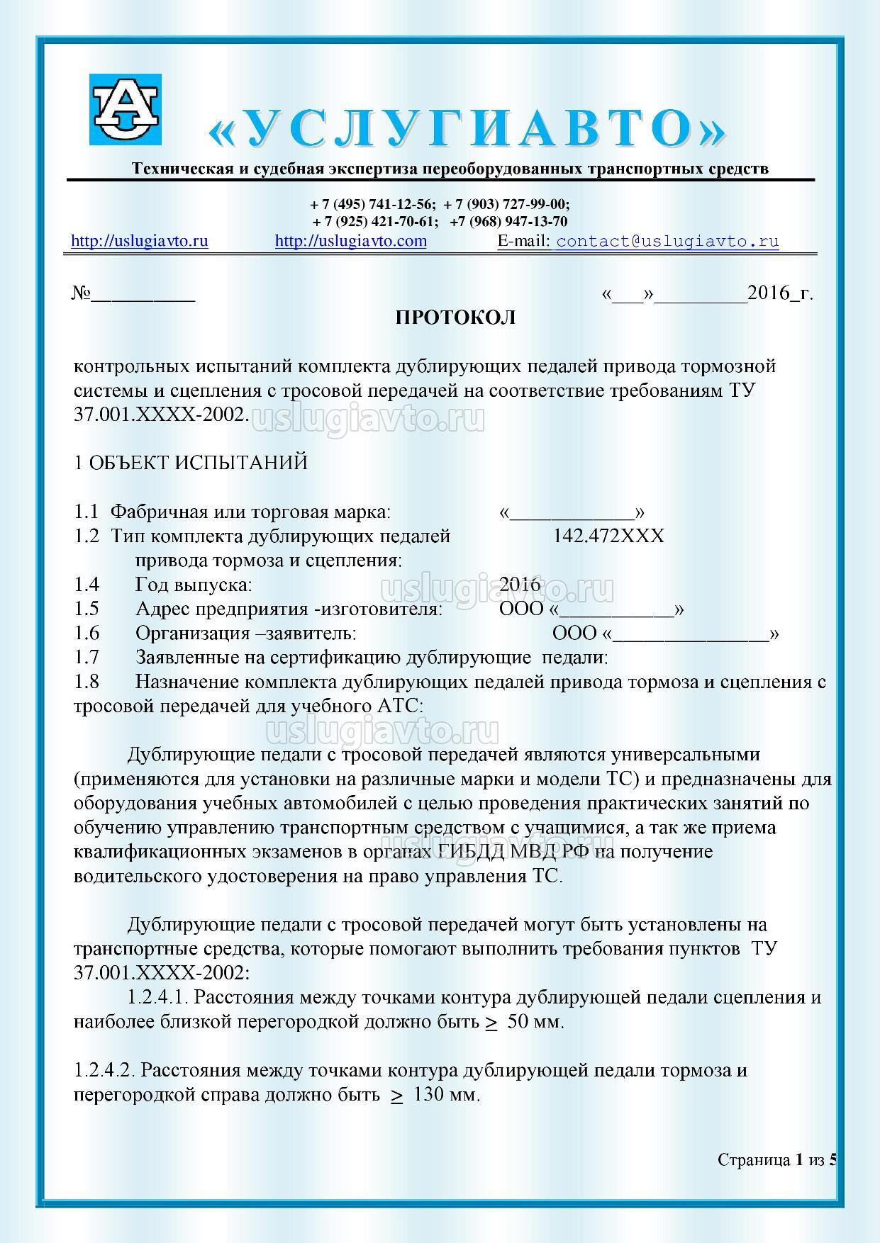 Протокол испытаний дублирующих педалей страница 1