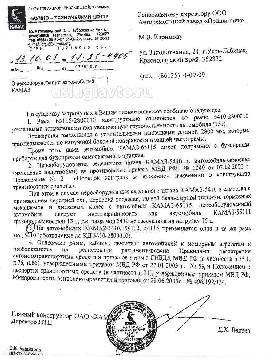 - письмо КАМАЗа об изменении разрешенной максимальной массы