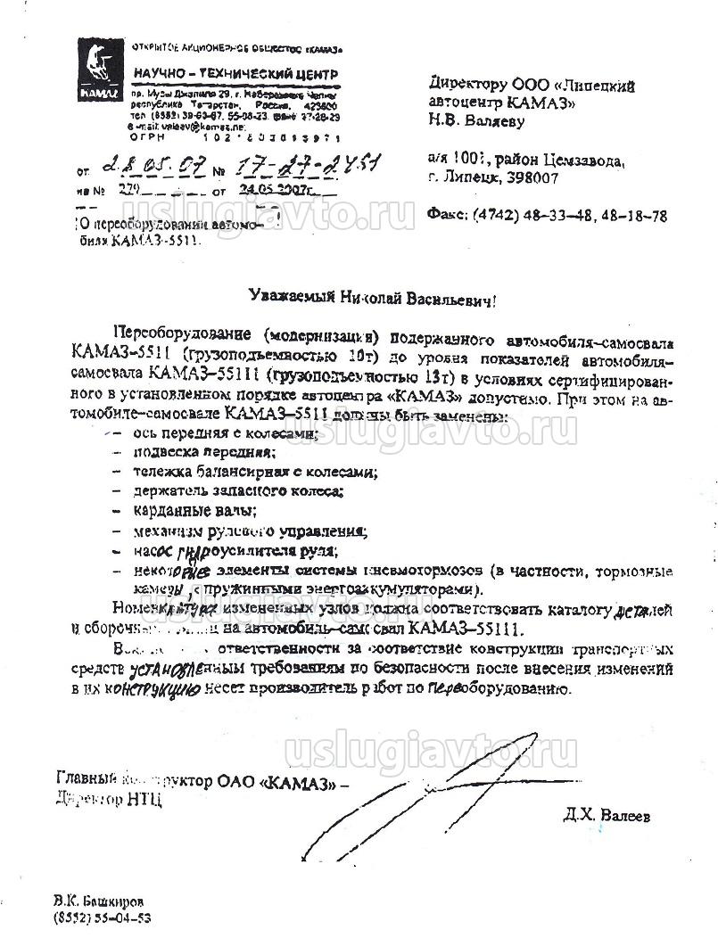 письмо КАМАЗа об изменении разрешенной максимальной массы