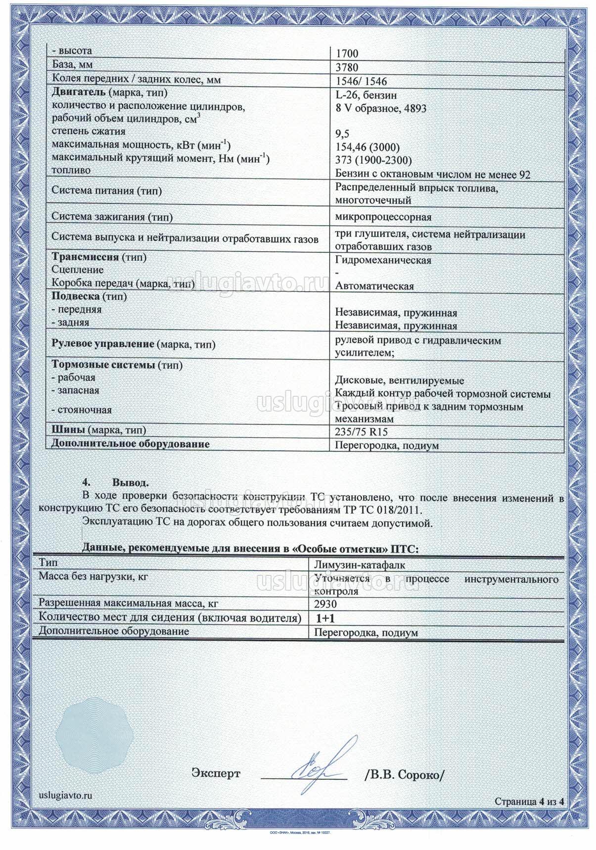 Переоборудуемый автомобиль, будет отвечать требованиям безопасности конструкции, при положительных результатах протокола технической экспертизы конструкции транспортного средства после внесения изменений и его эксплуатация по дорогам общего пользования в качестве специального автотранспортного средства для оказания ритуальных услуг, где предусмотрена перевозка исключительно сидящих пассажиров (количество мест для сидения – 8, не считая водителя) и по левому борту установлен подиум, категории ТС М1С "В", с уточнением массы без нагрузки и последующим внесением изменений в п.15 ПТС, считаем допустимой при положительных результатах проверки технического состояния на соответствие требованиям ТР ТС 018/2011.