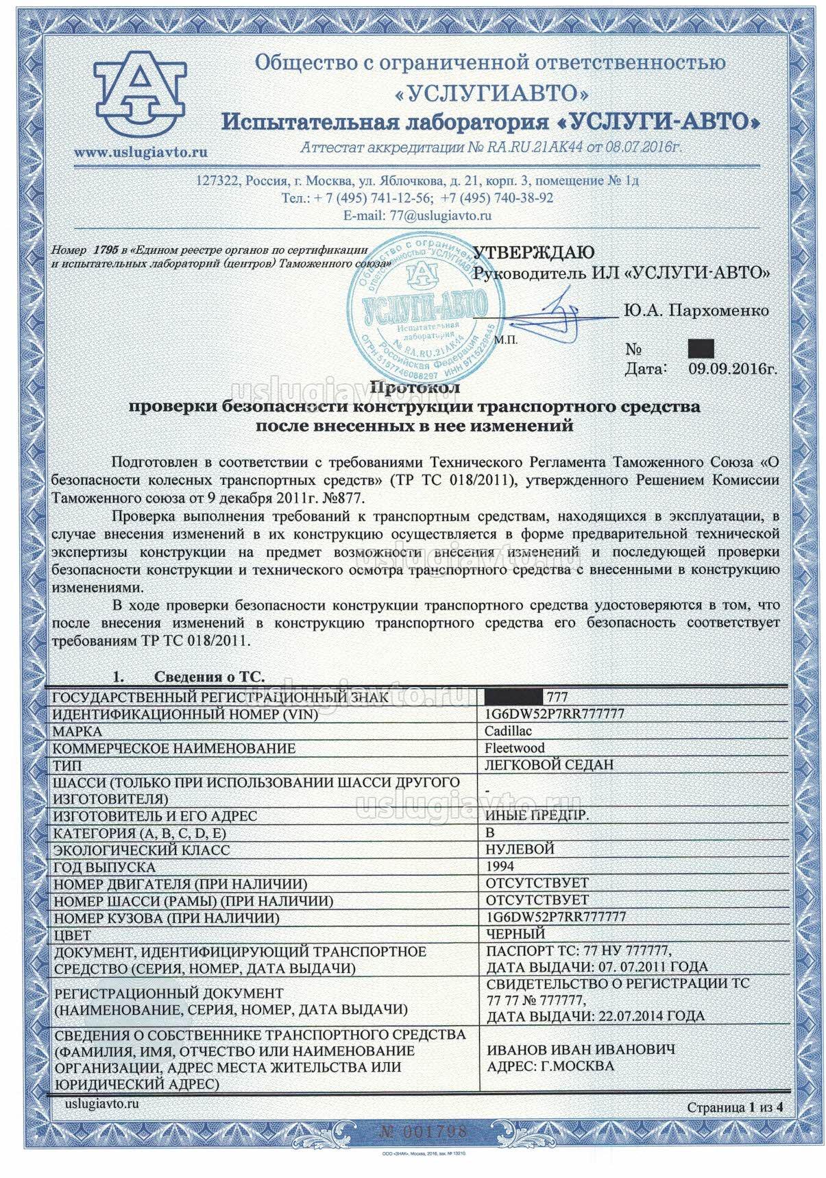 Протокол проверки безопасности конструкции транспортного средства после внесенных в нее изменений