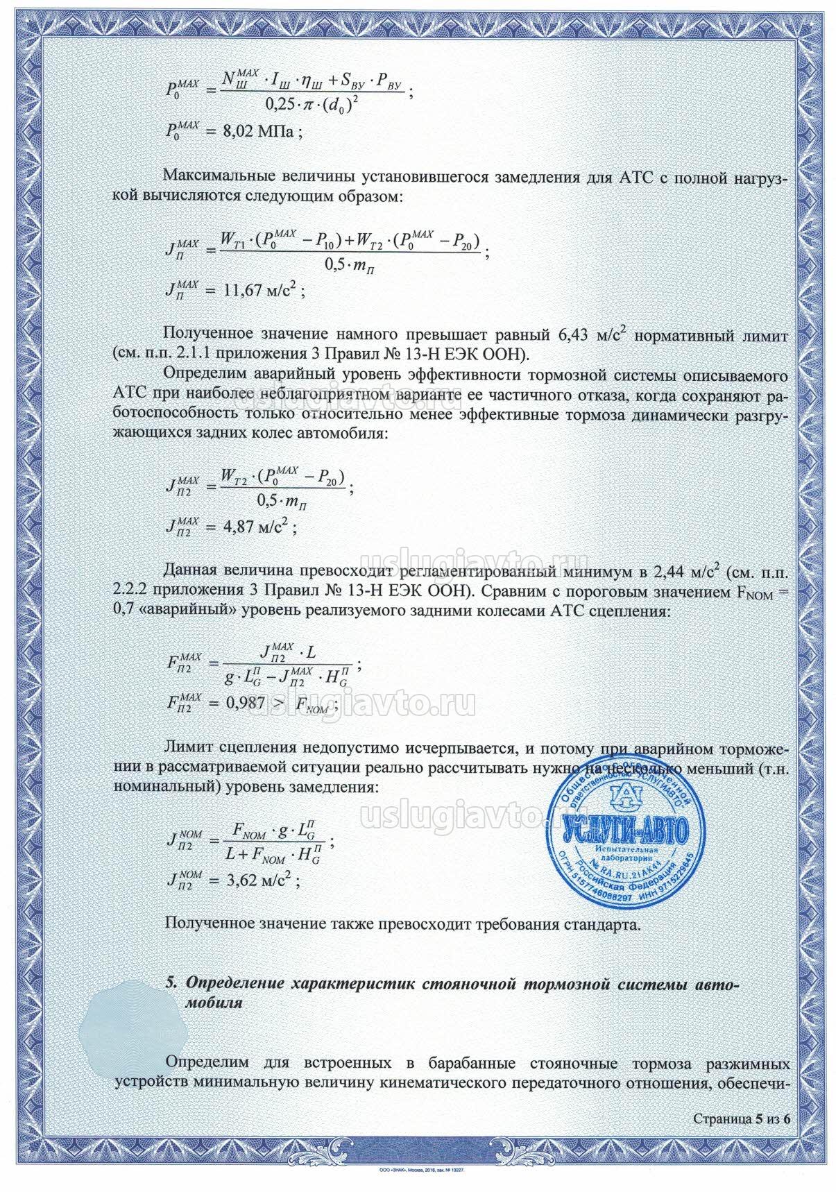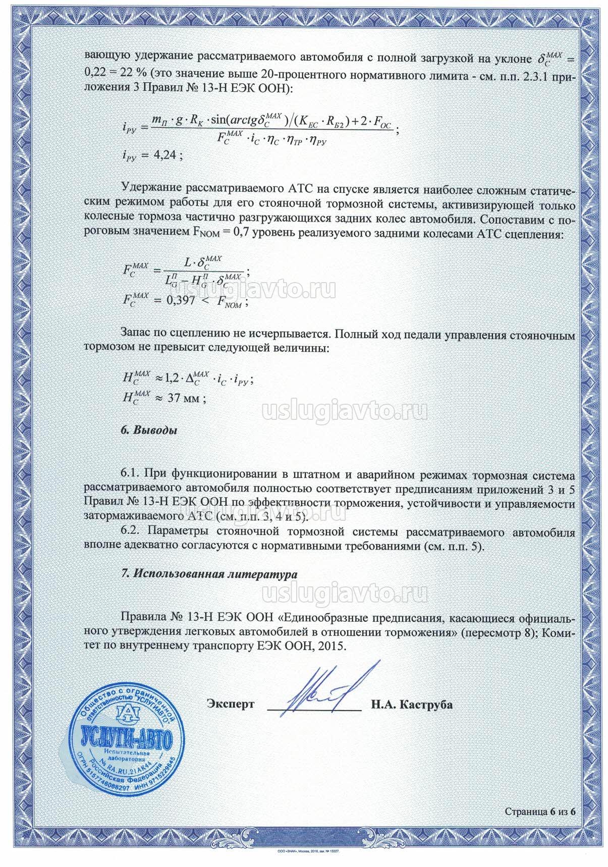 При функционировании в штатном и аварийном режимах тормозная система рассматриваемого автомобиля полностью соответствует предписаниям приложений 3 и 5 Правил № 13-Н ЕЭК ООН по эффективности торможения, устойчивости и управляемости затормаживаемого АТС.
