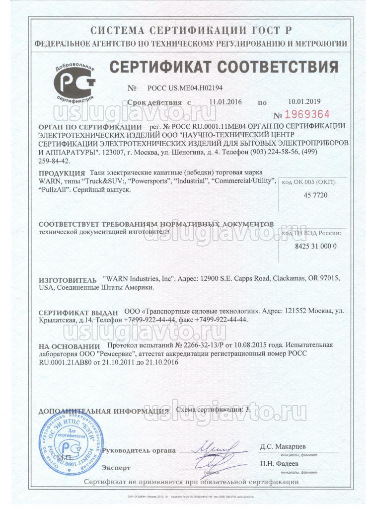 Сертификат № РОСС US.ME04.H02194 на продукцию "Тали электрические канатные (лебедки) торговая марка WARN, изготовителя "WARN Industries, Inc"", серийный выпуск.