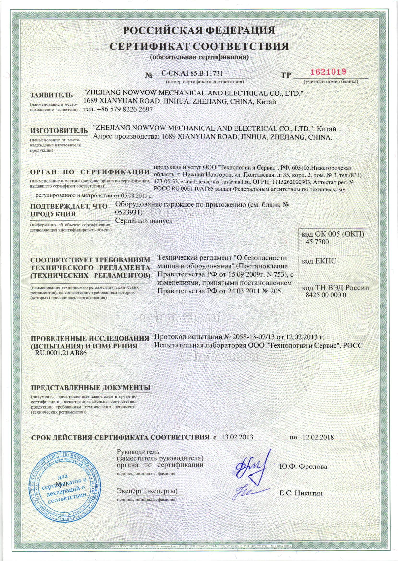 Сертификат № С-CN.AГ85.В.11731 на продукцию "Оборудование гаражное, изготовителя "ZHEJIANG NOWVOW MECHANICAL AND ELECTRICAL CO., LTD."", серийный выпуск.