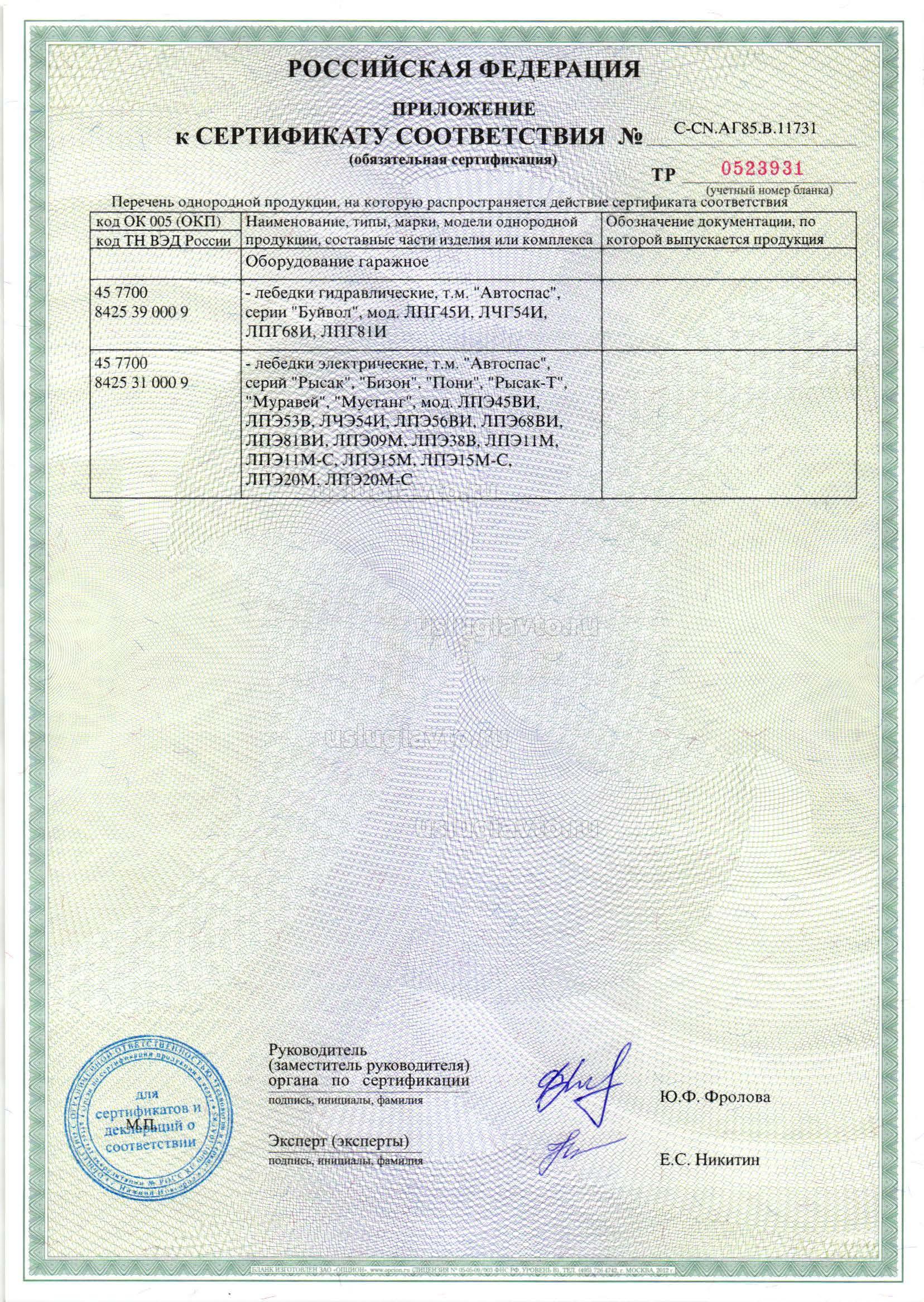 Сертификат №РОСС CN.AH32.H02651 на продукцию "Тали электрические канатные (лебедки) торговая марка WARN", изготовителя"WARN Industries, Inc"", серийный выпуск.