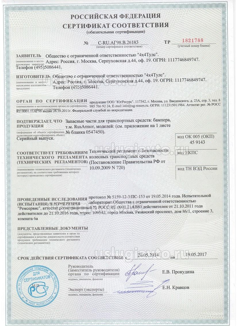 Сертификат № C-RU.AГ98.B.26183 на продукцию "Запасные части для транспортных средств: бампера, т.м. RusArmor , изготовителя ООО "4х4Тулс"", серийный выпуск.