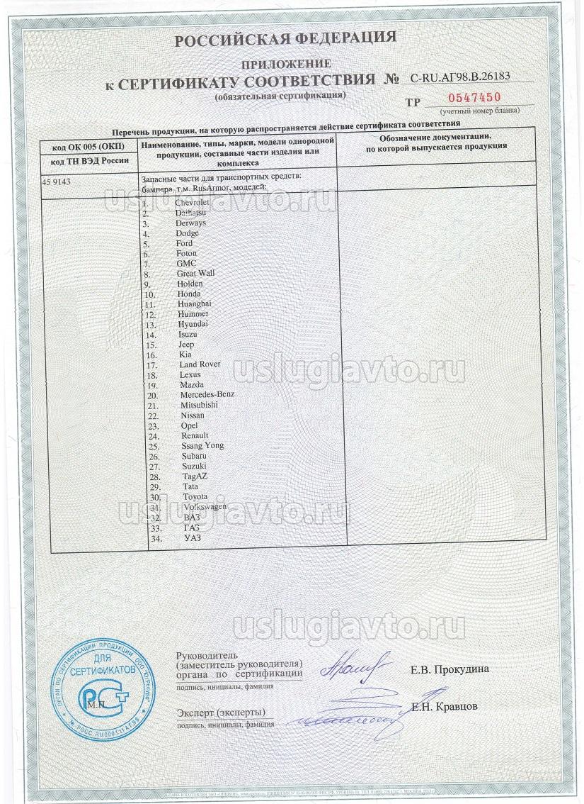 Приложение к сертифиткату № C-RU.AГ98.B.26183 на продукцию "Запасные части для транспортных средств: бампера, т.м. RusArmor , изготовителя ООО "4х4Тулс"", серийный выпуск.