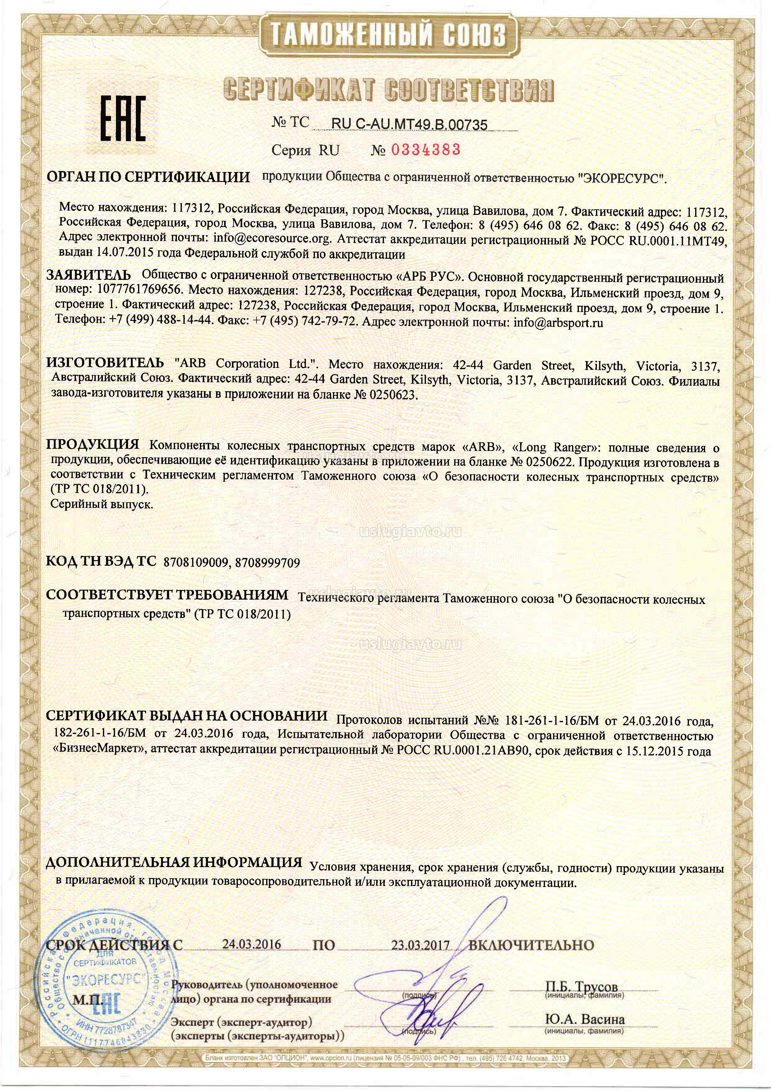 Сертификат № RU C-AU.MT49.В.00735 на продукцию "Компоненты колесных транспортных средств марок «ARB», «Long Ranger», изготовителя "ARB Corporation Ltd."", серийный выпуск.