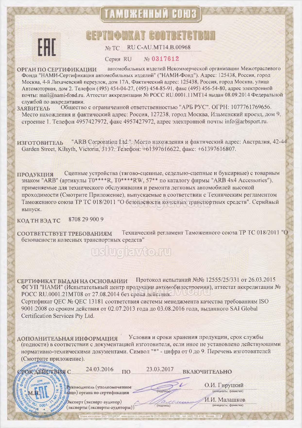 Сертификат № ТС RU C-AU.MT14.B.00968 на продукцию "Сцепные устройства (тягово-сцепные, седельно-сцепные и буксирные) с товарным знаком "ARB", «Long Ranger», изготовителя "ARB Corporation Ltd."", серийный выпуск
