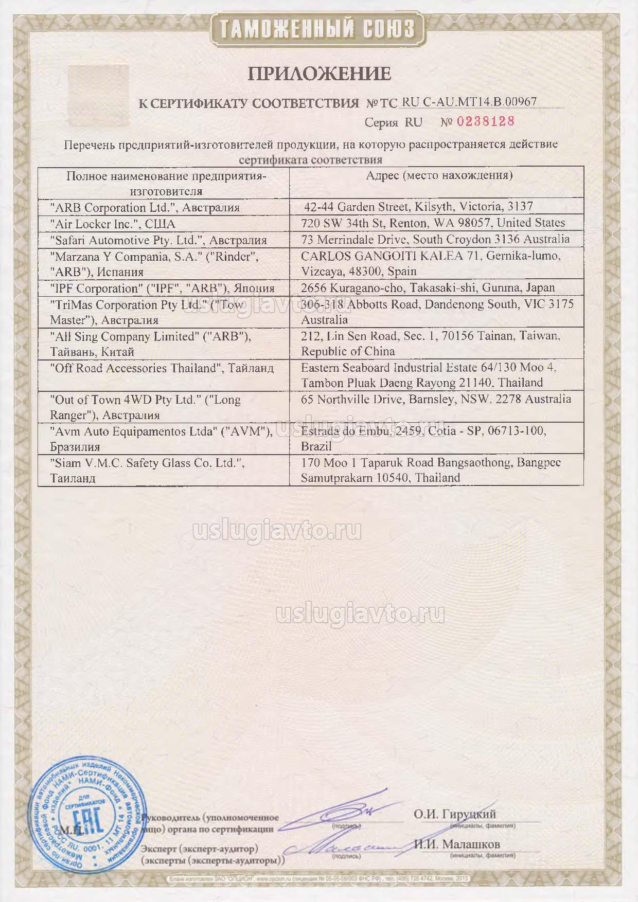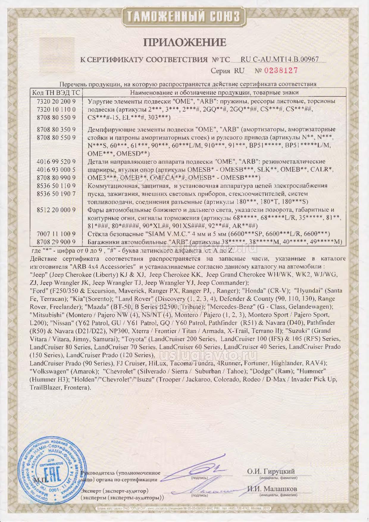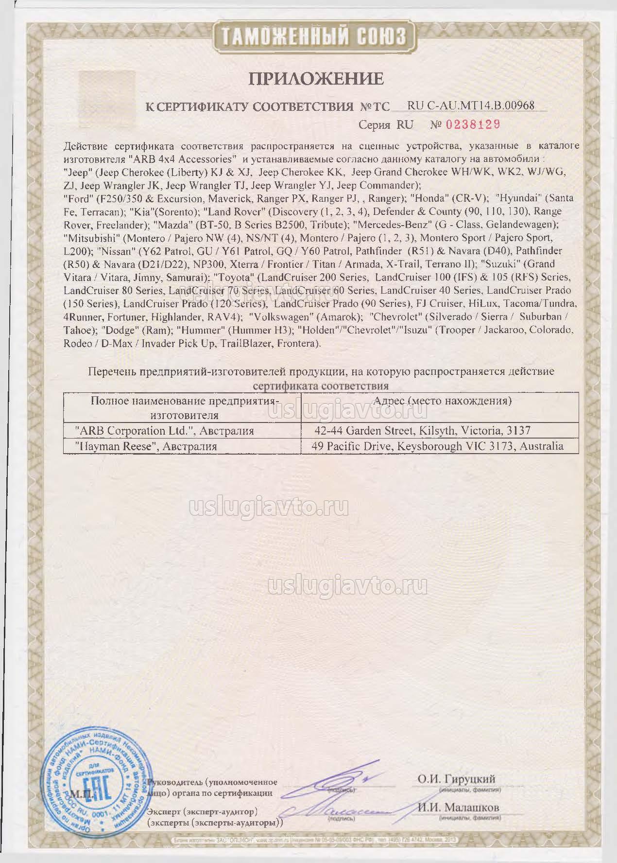Приложение к сертификату № TC RU C-AU.MT14.B.00967 на продукцию "Запасные части по каталогу "ARB 4x4 Accessories", изготовителя "ARB Corporation Ltd."", серийный выпуск._страница 1