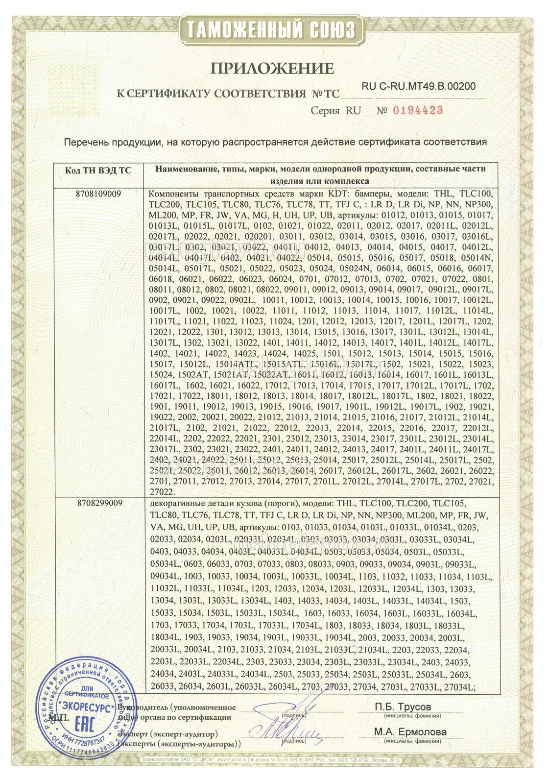 Компоненты транспортных средств, марка KDT: бамперы, декоративные детали кузова (пороги, накладки, ободки фар), предназначенные для полноприводных транспортных средств повышенной проходимости категории M1G, модели и артикулы указаны в приложении на бланках № 0194423, 0194424. Продукция изготовлена в соответствие с Техническим регламентом Таможенного союза "О безопасности колесных транспортных средств" (ТР ТС 018/2011). Серийный выпуск.