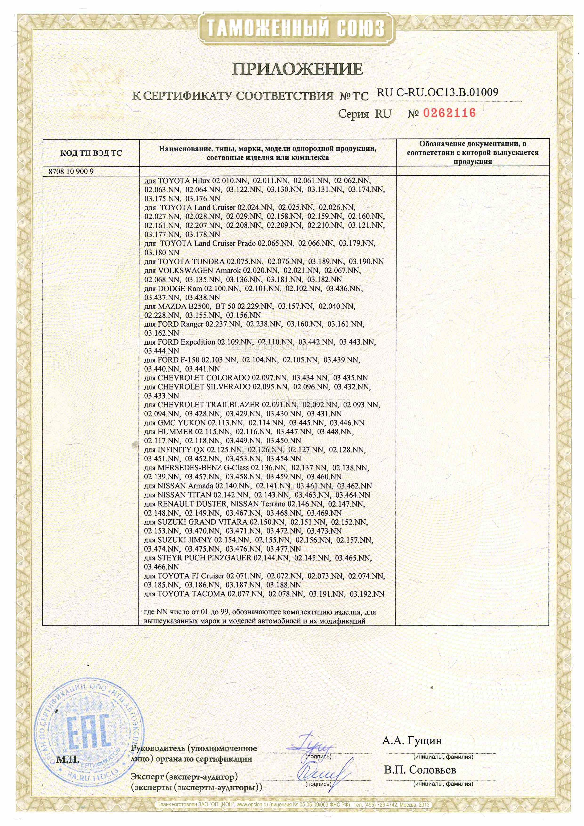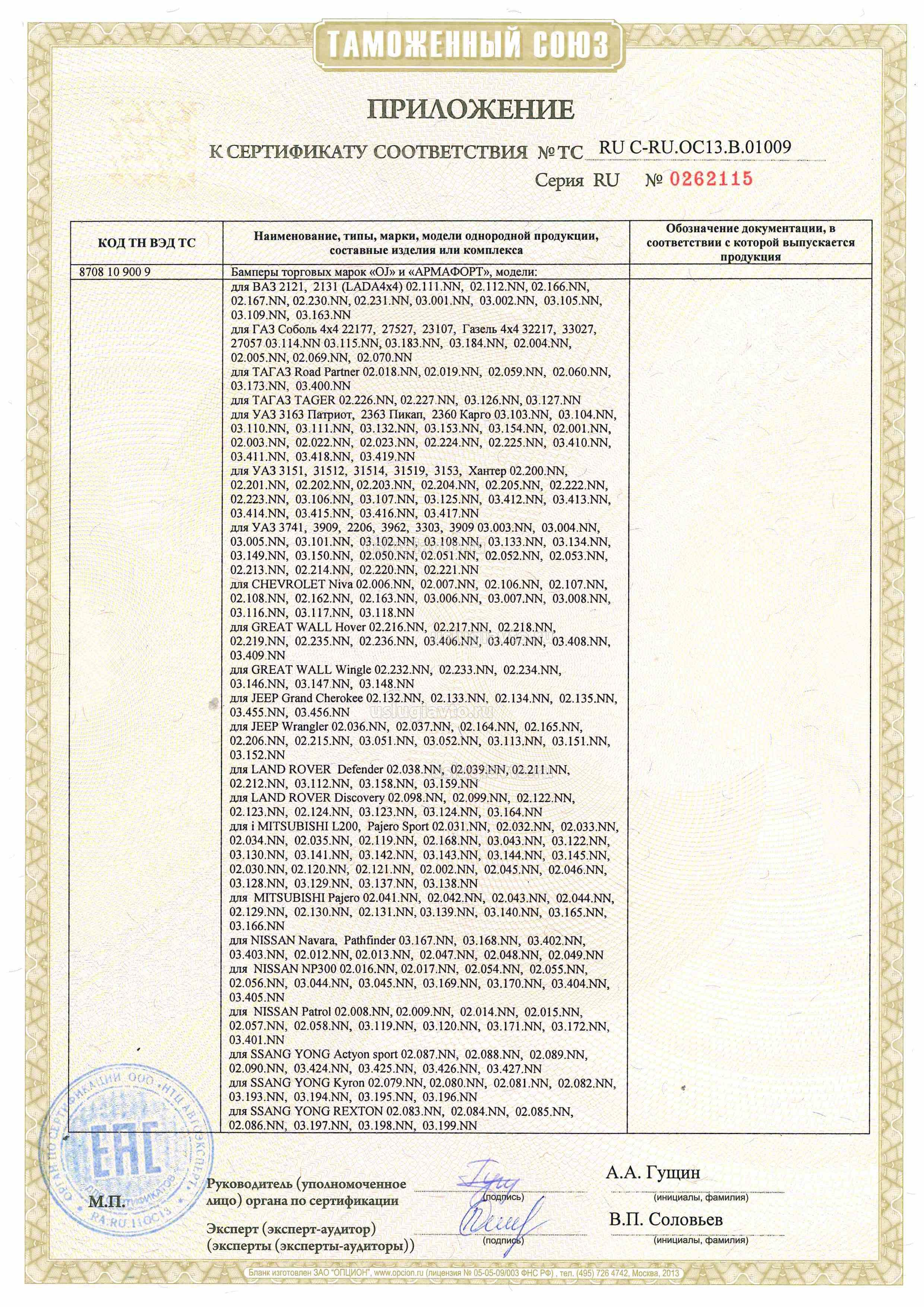 Приложение к сертификату № TC RU C-RU.ОС13.01009 на продукцию "Бамперы торговых марок «OJ» и «АРМАФОРТ», изготовителя Общество с ограниченной ответственностью Производственная компания «Силовые конструкции»", серийный выпуск._страница 1