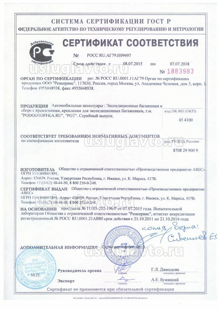 Сертификат № РОСС RU.АГ79.Н09497 на продукцию "Автомобильные аксессуары : Экспедиционные багажники в сборе с креплениями, крепления для экспедиционных багажников, изготовителя Общество с ограниченной ответственностью "Производственное предприятие АВЕС"", серийный выпуск