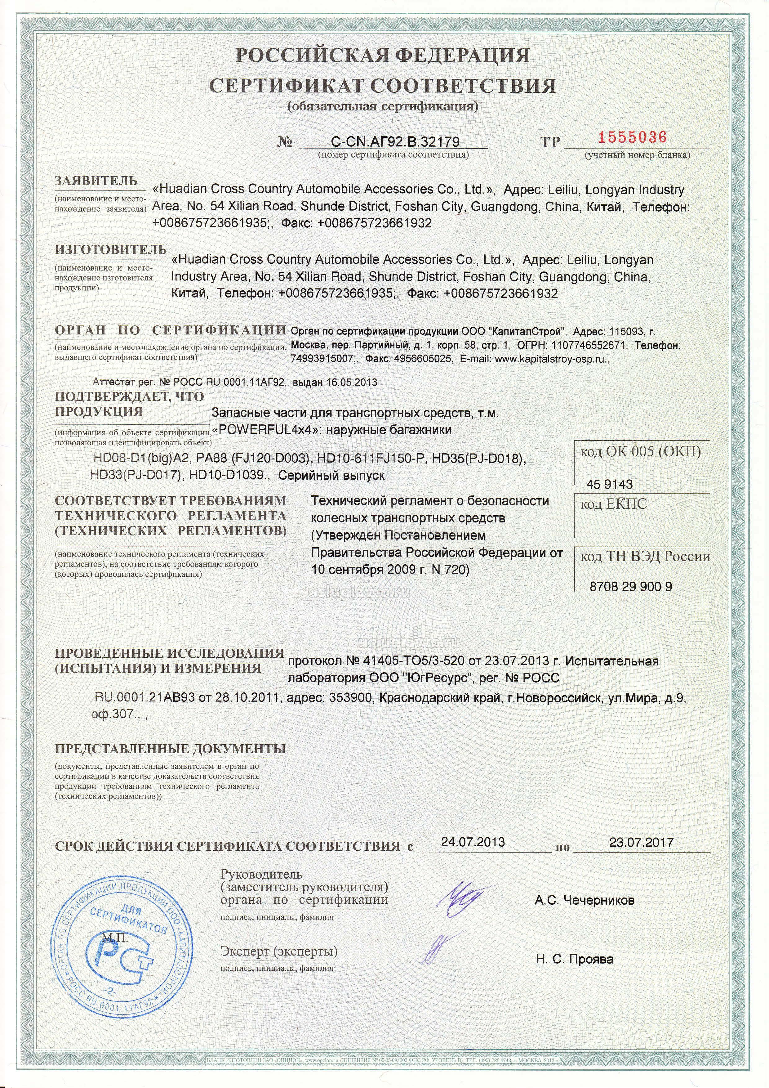 Сертификат № C-CN.AГ92.B.32179 на продукцию Запасные части для транспортных средств, т.м. «POWERFUL4х4», изготовителя «Huadian Cross Country Automobile Accessories Co., Ltd.»", серийный выпуск.
