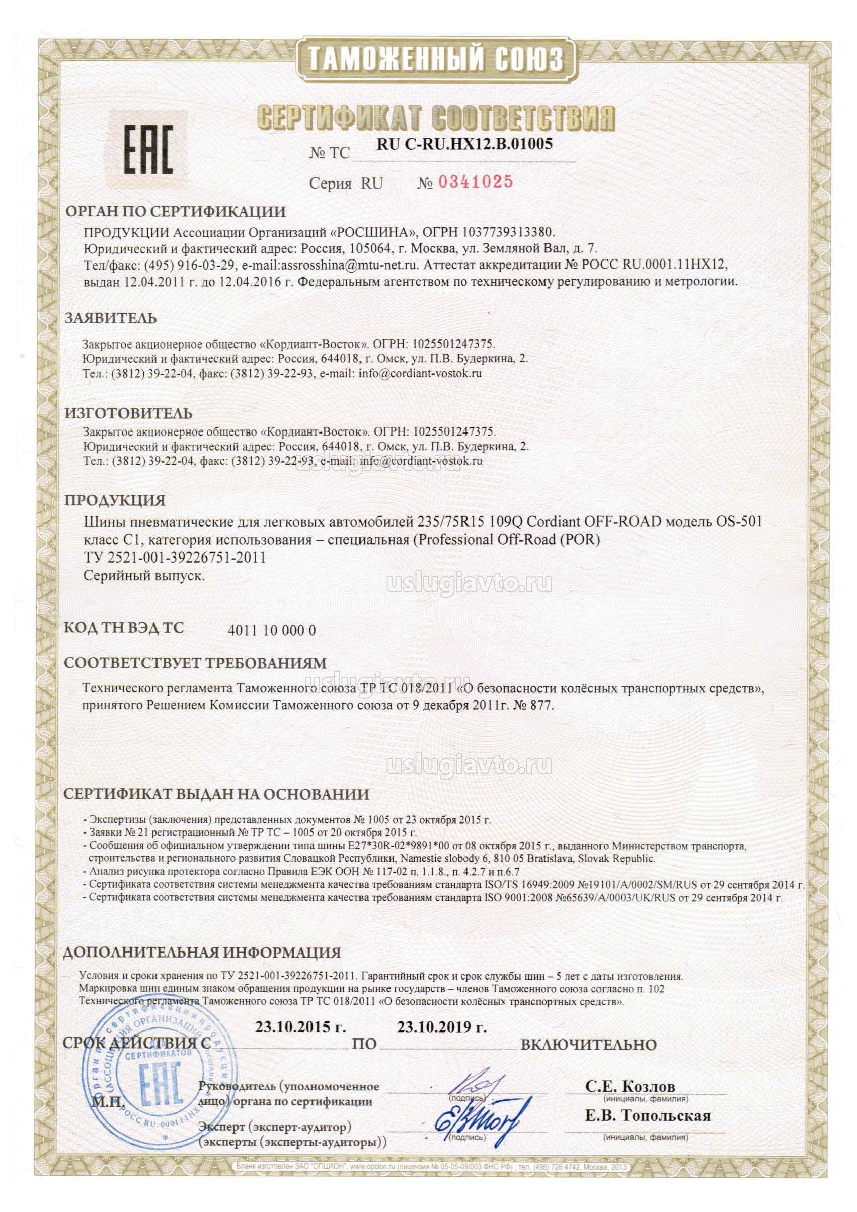 Сертификат № ТС RU C-RU.HX12.В.01005 на продукцию "Шины пневматические для легковых автомобилей 235/75R15 109Q, изготовителя Закрытое акционерное общество «Кордиант-Восток», серийный выпуск.