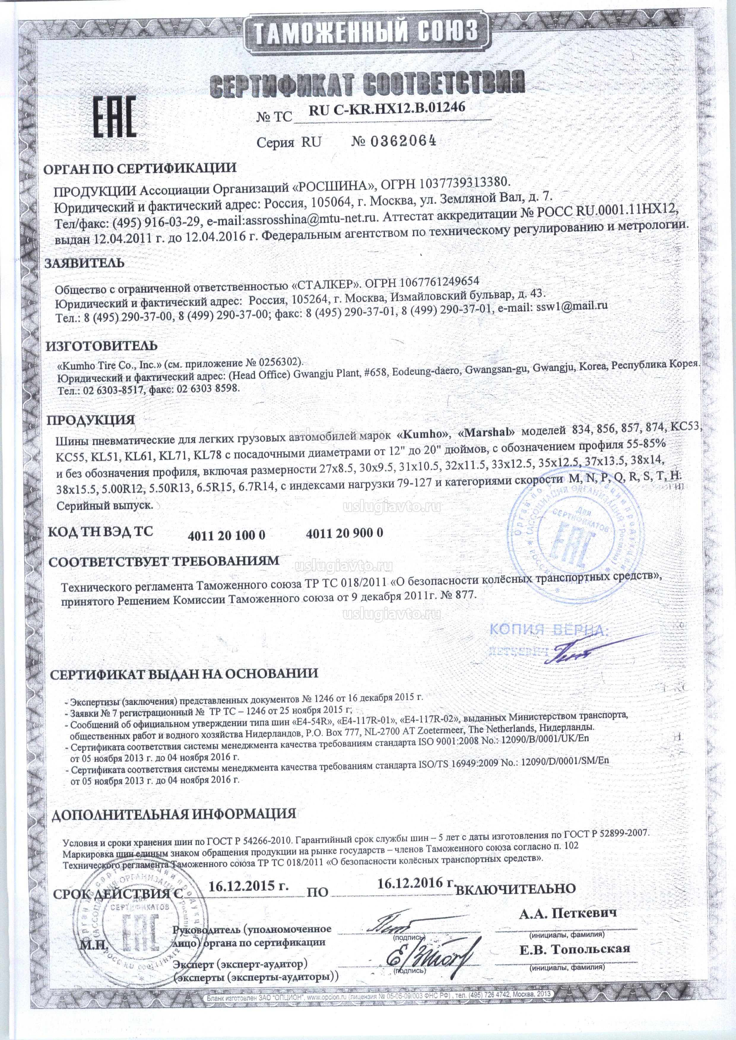 Сертификат № RU C-KR.HX12.B.01246 на продукцию "Шины пневматические для легких грузовых автомобилей марок «Kumho», «Marshal», изготовителя «Kumho Tire Со., Inc.»", серийный выпуск.